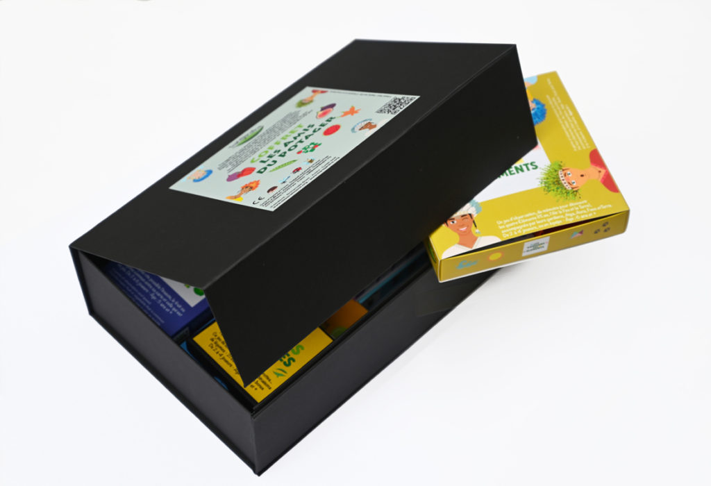 Les cartes ont été imprimées en France, les boîtes en Italie, et l’assemblage des jeux a été réalisé en collaboration avec l’ASEI de la Plaine St Denis, association spécialisée dans l’accompagnement, l’éducation, l’insertion des personnes en situation de handicap et des personnes dépendantes et fragilisées.