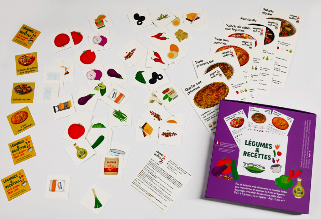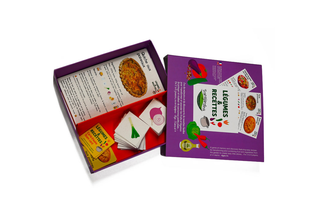 Contenu : 6 cartes recettes 8 × 15 cm bilingues (anglais au verso), 54 cartes ingrédients, 6 cartes équipe 4 × 4 cm.