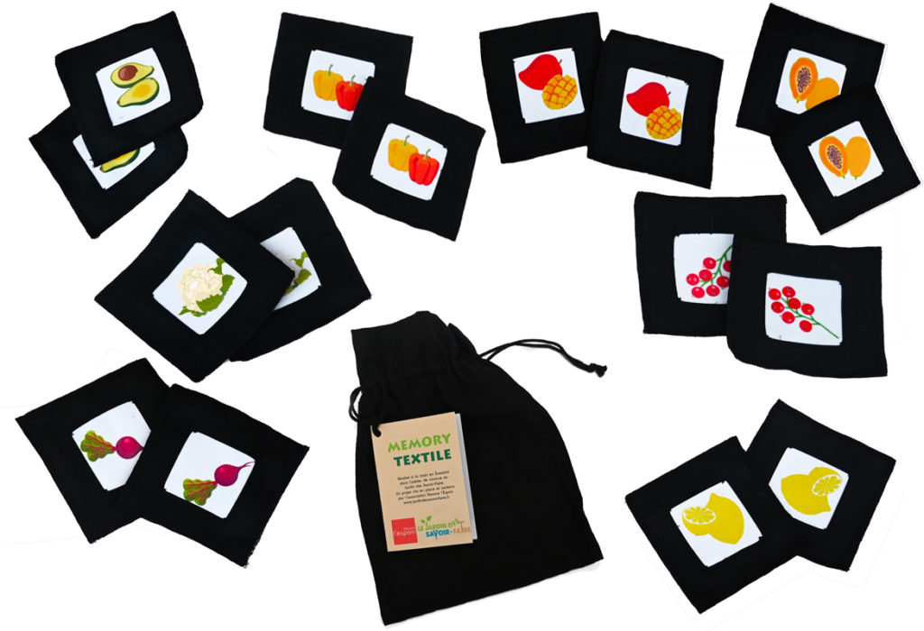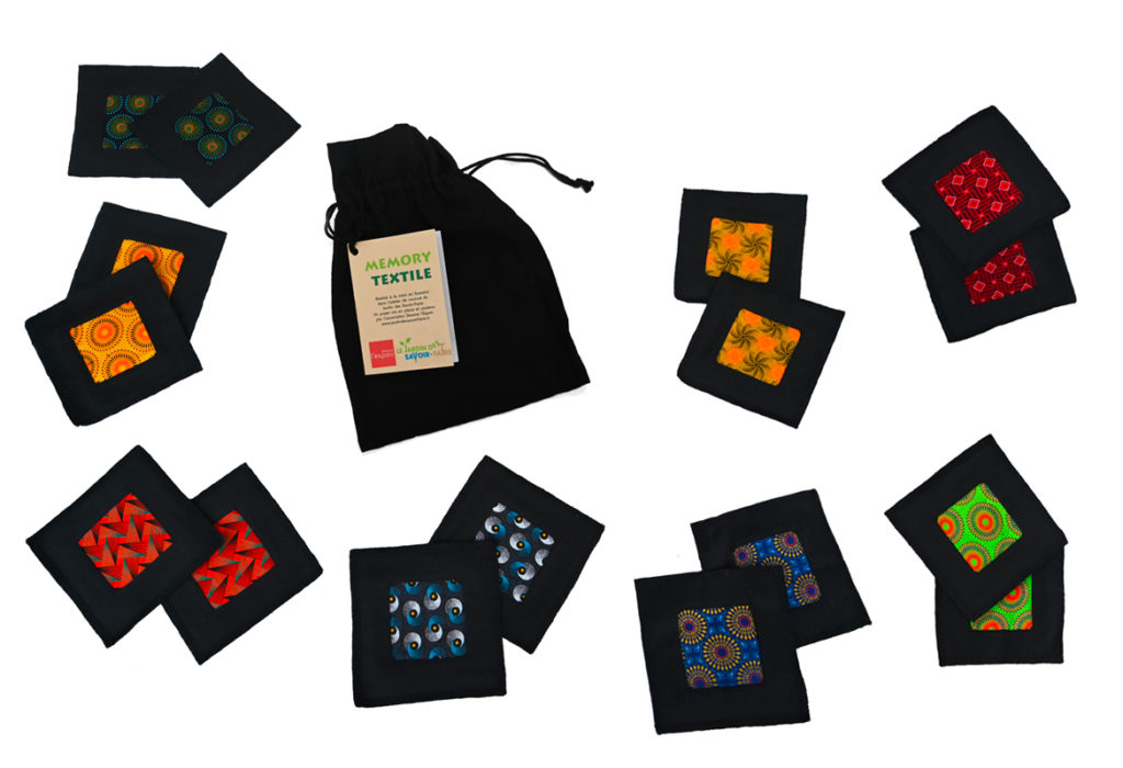 L’association Dessine l’Espoir a également associé à ce coffret l’atelier du Jardin des Savoir-Faire en Eswatini, qui a réalisé 6 jeux de memory textiles comprenant chacun 16 carrés dans un sac en coton (2 déclinent des carrés du tissu traditionnel shweshwe, avec différents motifs et coloris, les 4 autres des légumes imprimés dont il faut aussi trouver les paires…)