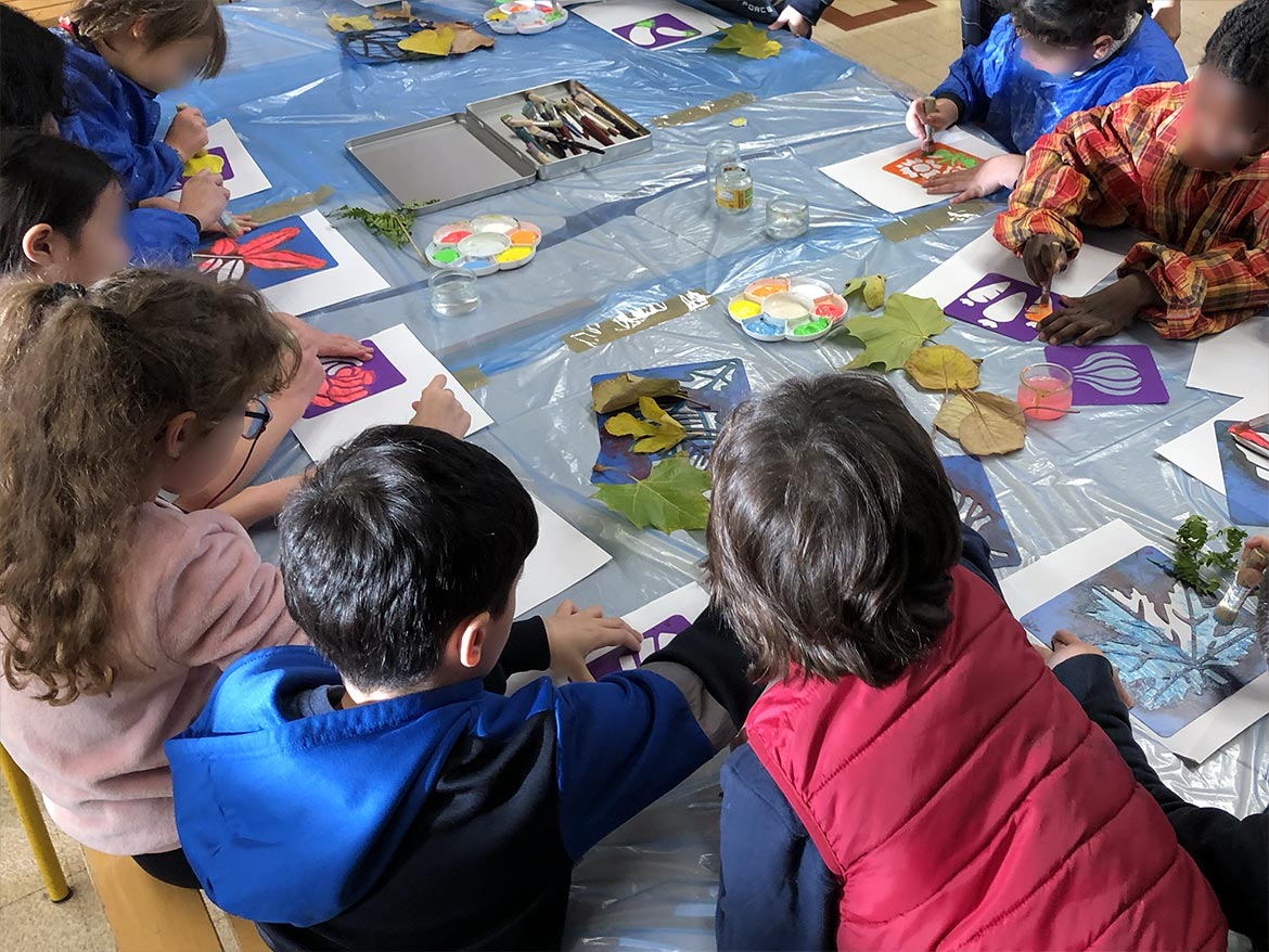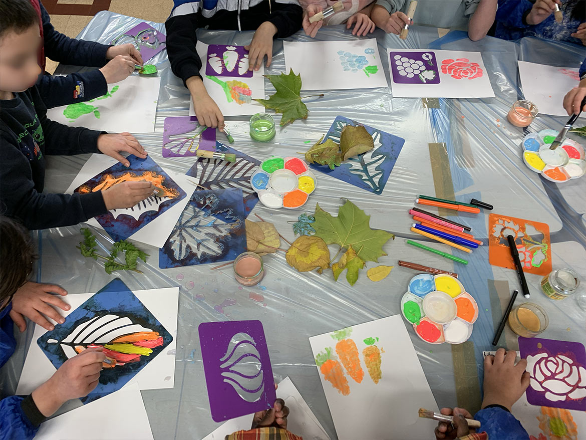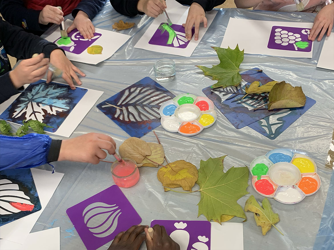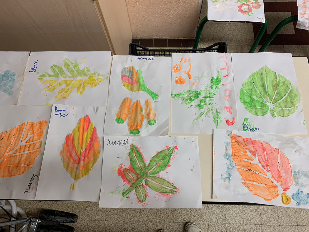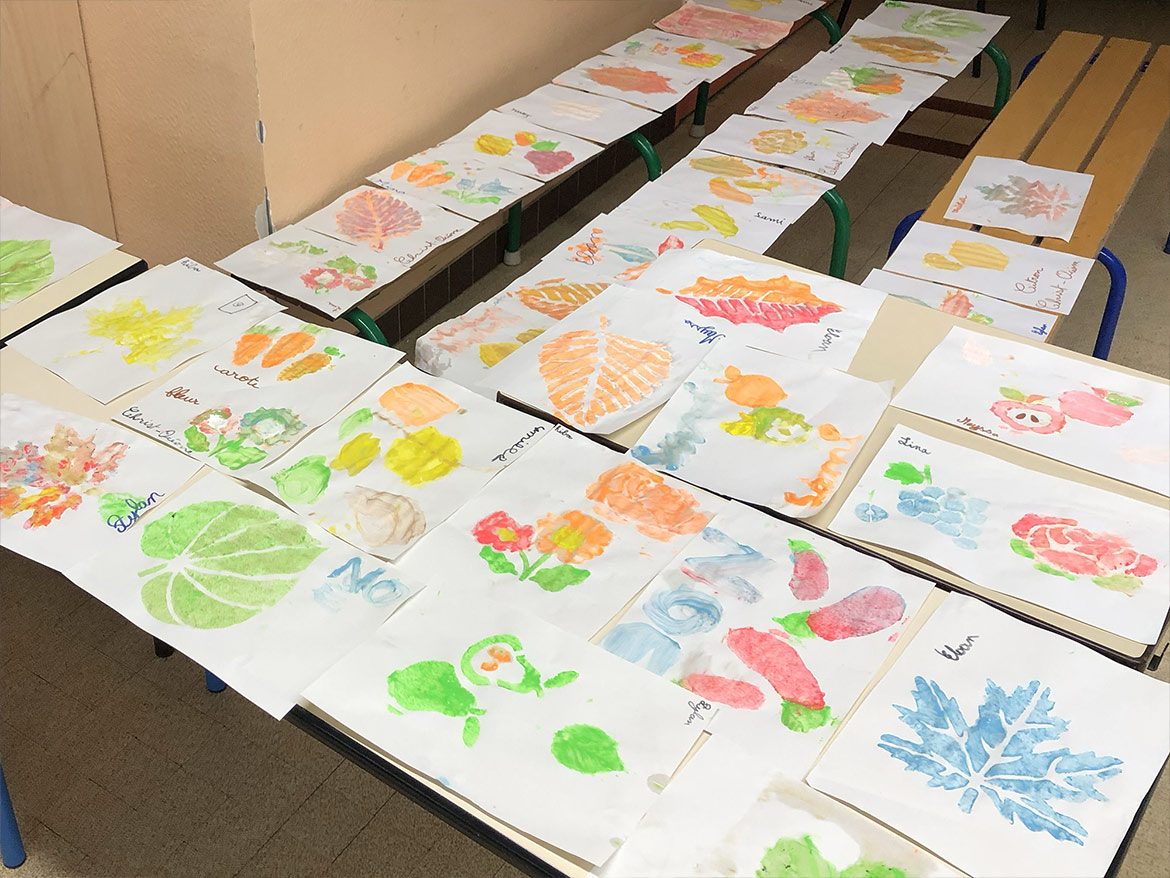 We organised a painting activity using our stencils representing all kinds of leaves, fruits and vegetables.