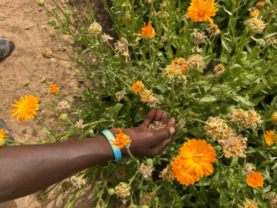 Harvesting calendula (marigold) seeds at the seed farm in Sandiara, Senegal