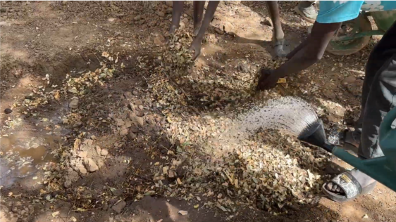 Les termitières abandonnées sont utilisées comme bioengrais en maraîchage. La terre est récupérée et sera mélangée pour constituer le substrat de la serre.