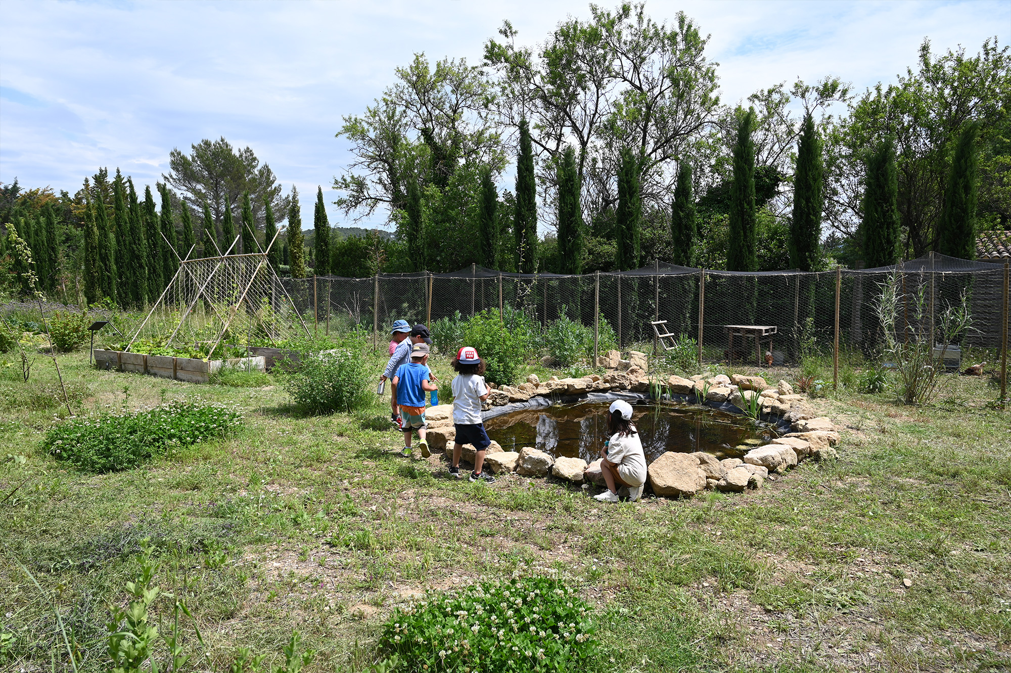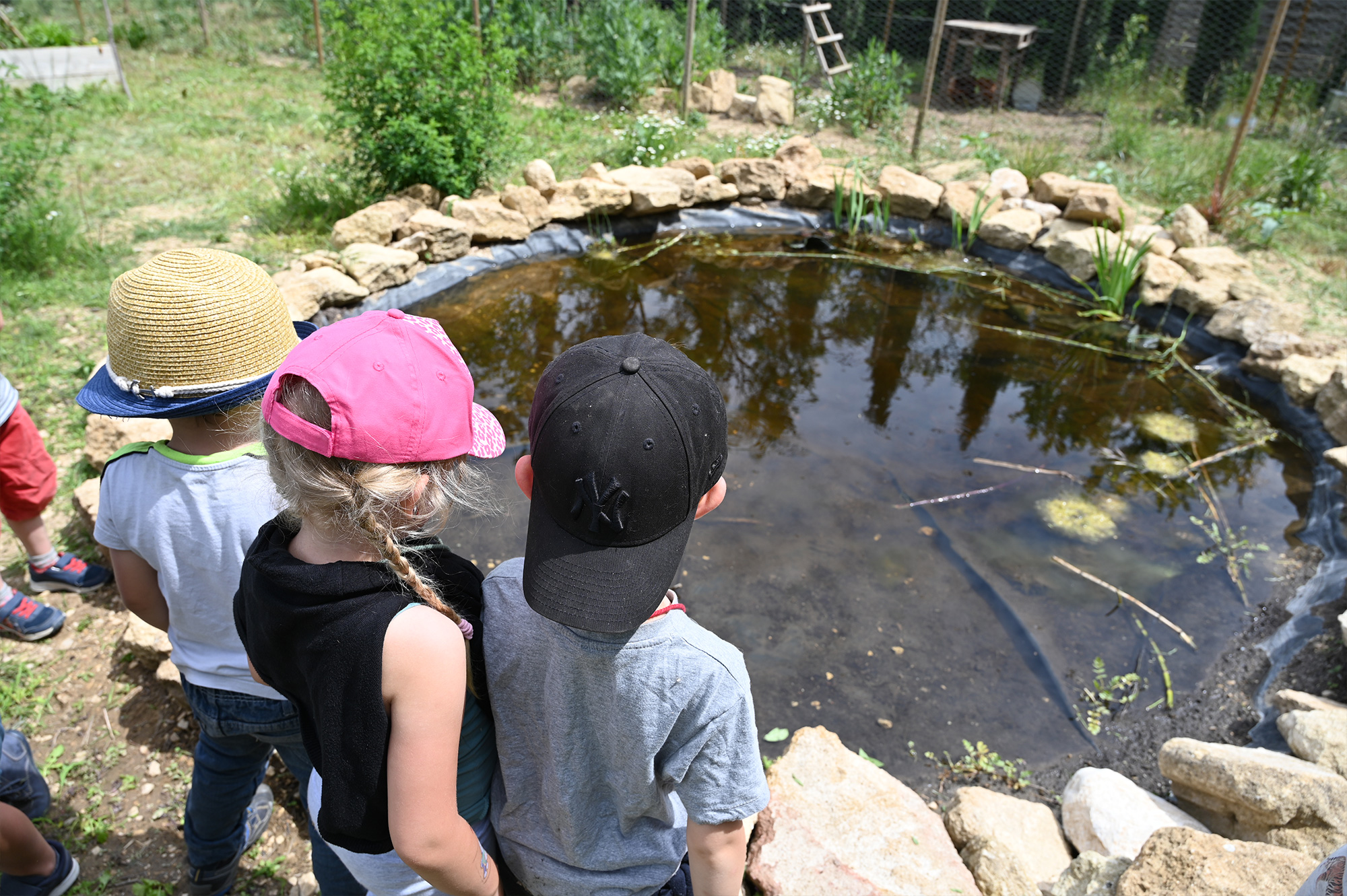 Lors de leur visite au Grand Potager, les élèves de l’école de Lauris ont pu observer la mare qui se situe à côté du poulailler, pour apprendre de nombreuses choses sur la biodiversité qui y est présente.