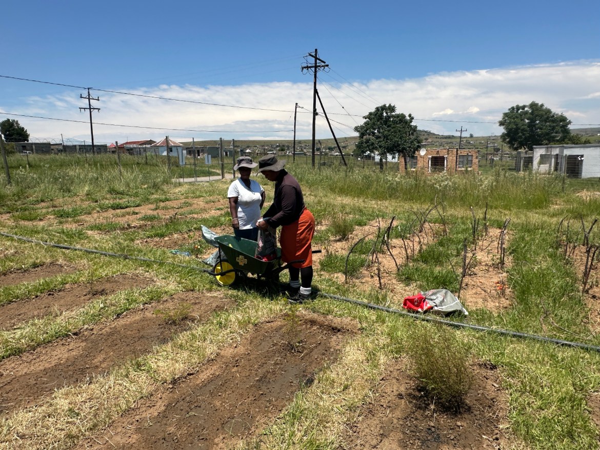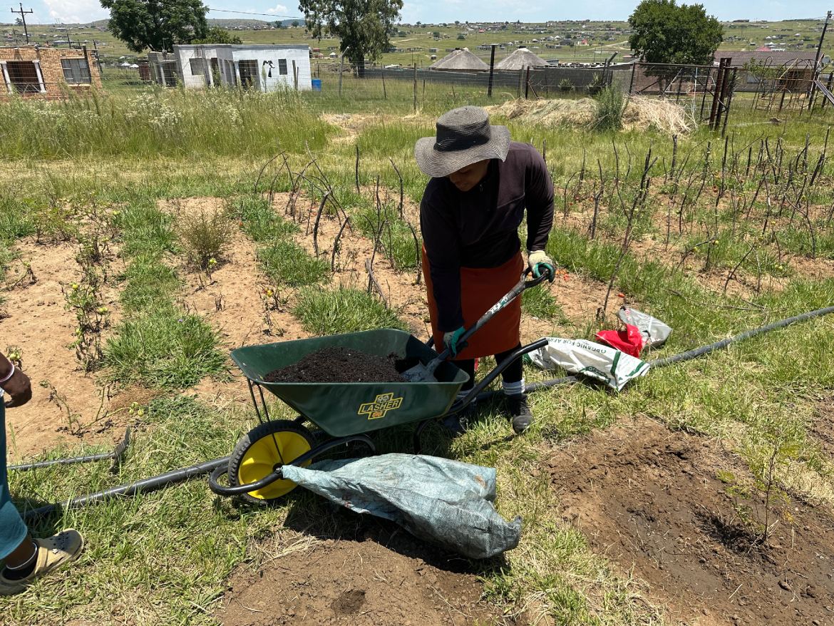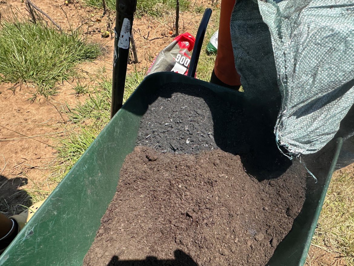 Before planting the seedlings produced in the nursery, the women in charge of the Roosboom Halfway House vegetable garden take care to enrich the soil to ensure good growth for the future plants. Fisani, who is in charge of the vegetable garden, prepares a mixture of compost, manure and biochar, a natural input produced in Bulembu, Eswatini, with the support of The Ivory Foundation. Biochar plays a key role: it captures water and nutrients and gradually releases them to the plants, thus improving soil fertility in the long term. In order to conserve resources, this mixture is incorporated directly into the soil when the plants are planted. This deep enrichment, to a depth of about 20 cm, supports the crops throughout their growth until maturity.