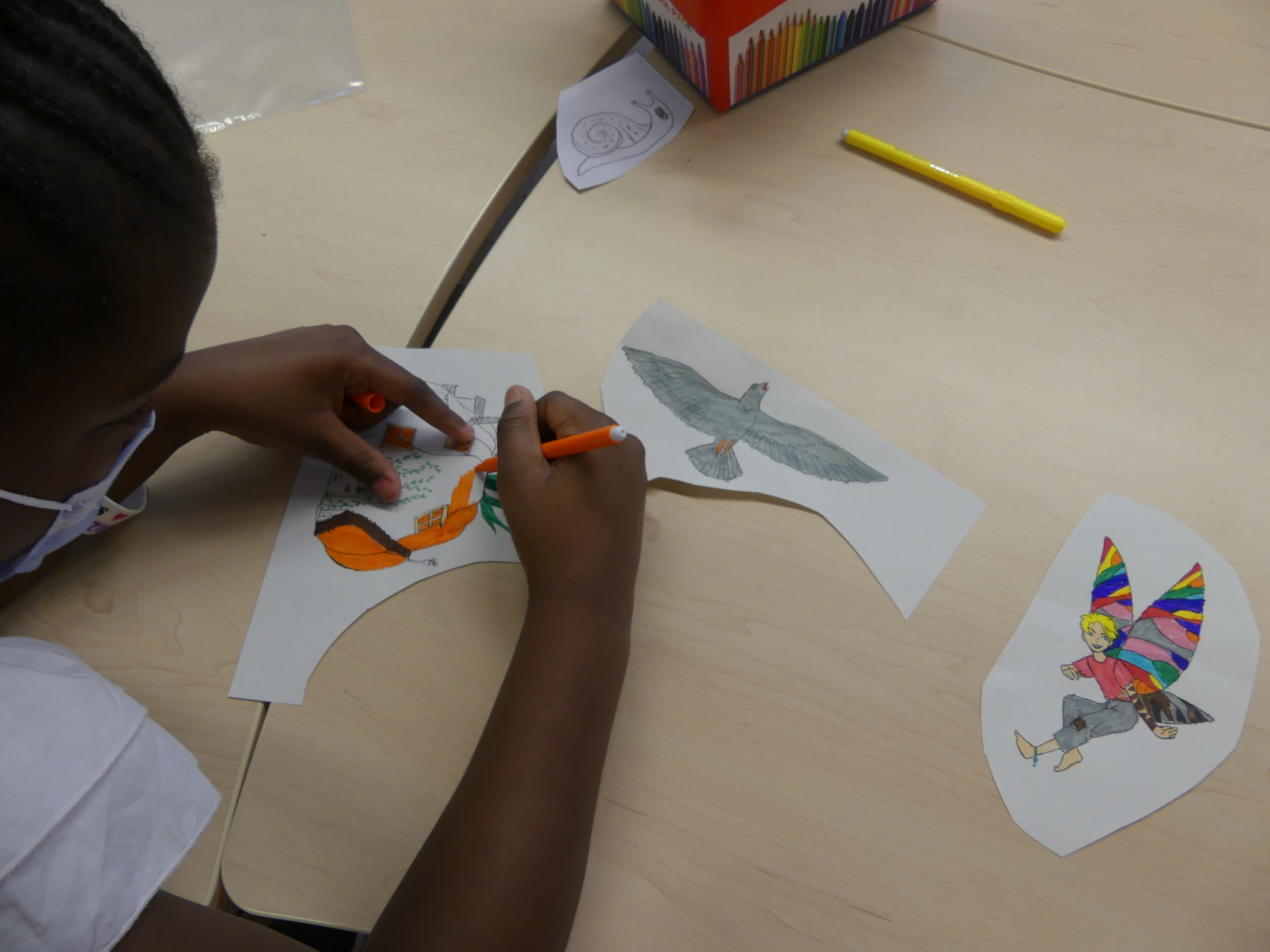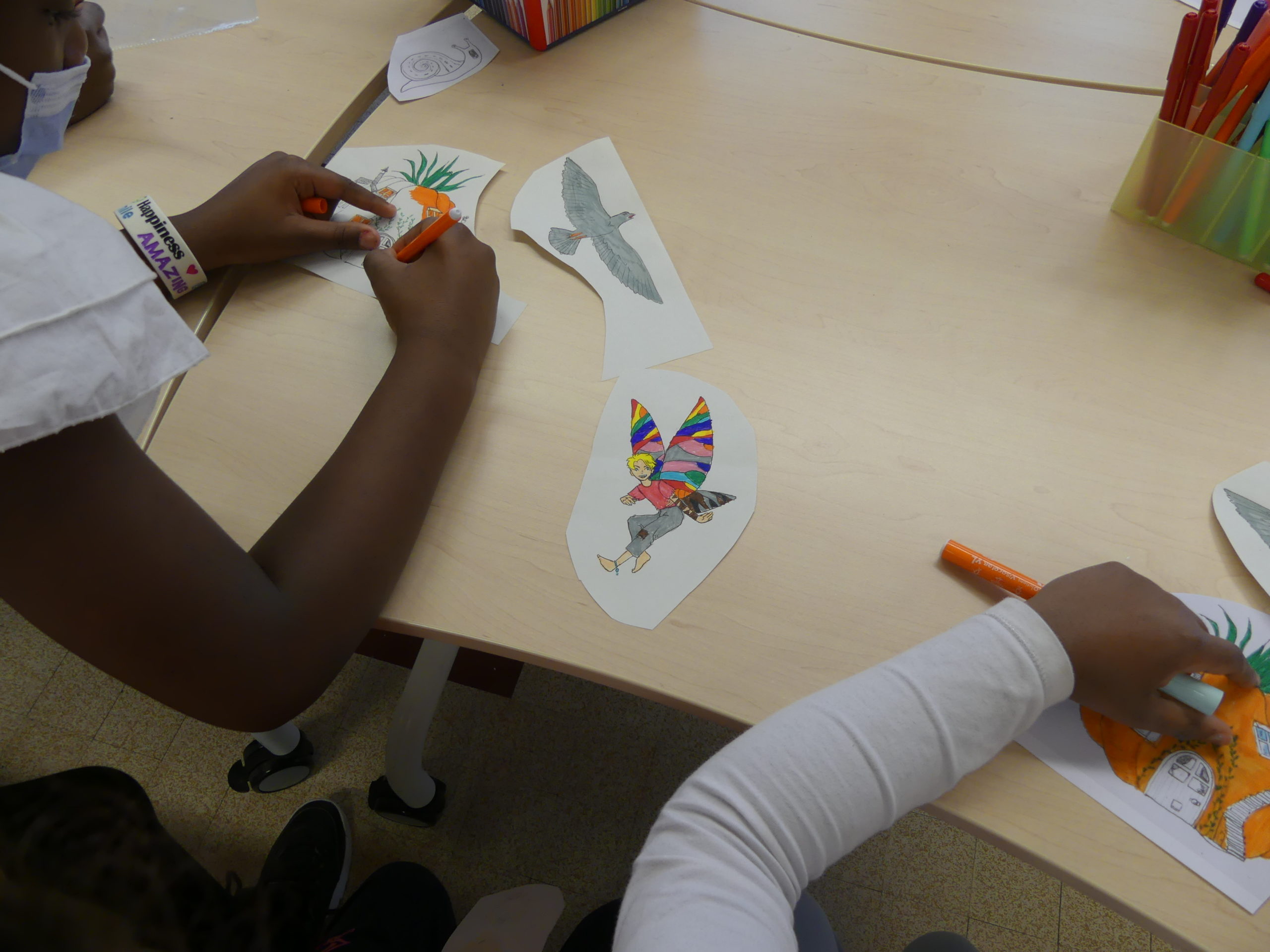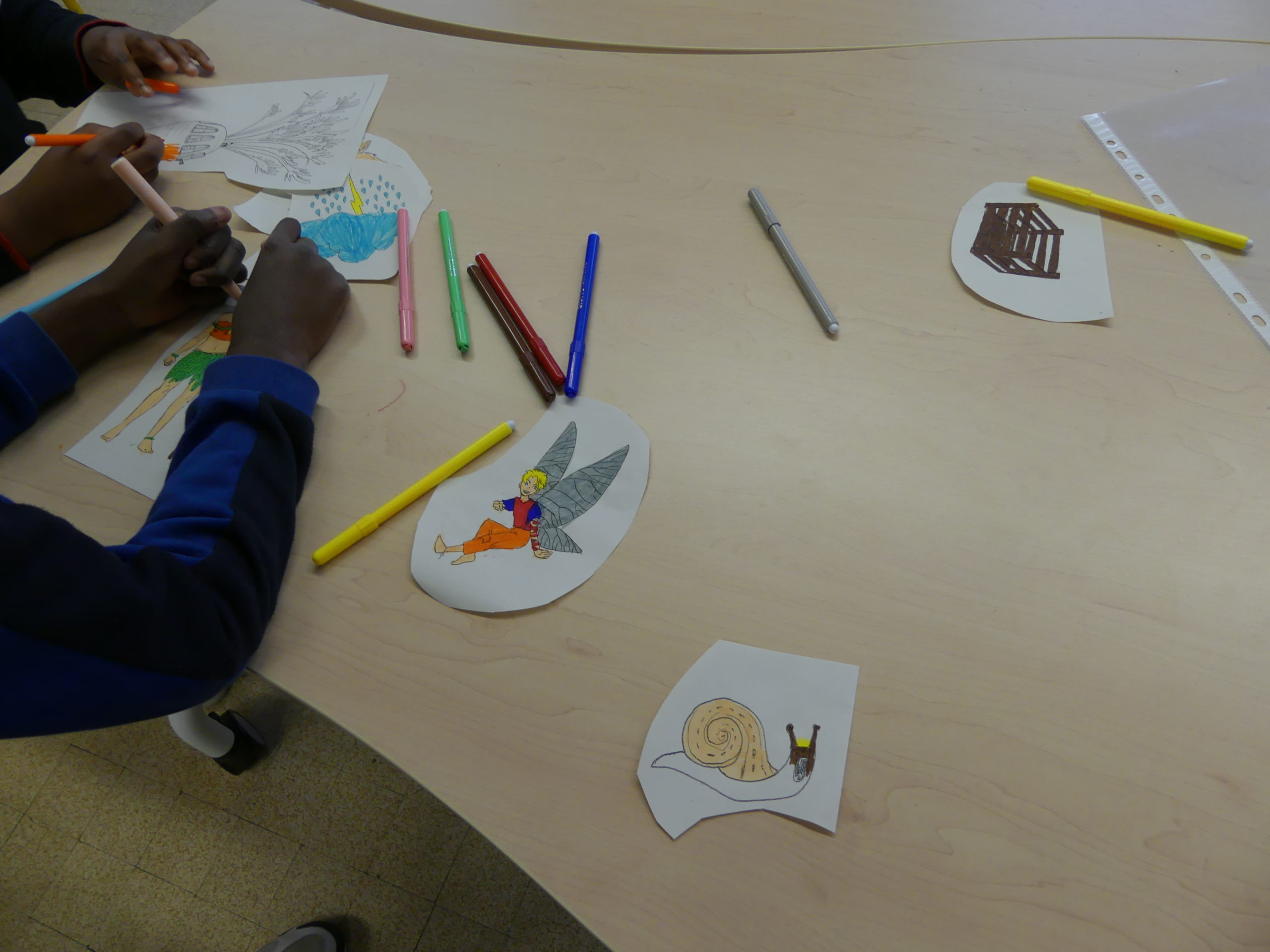 First step: cutting out and colouring the paper templates that will bring to life all the stories that the children made up. Fairies, boares, feathers, pumpkin houses, she-warriors… that is a lot of material for creativity ! Once the templates were finished, they were fixed on top of bamboo sticks which will be used to move them on the theatre scene.
