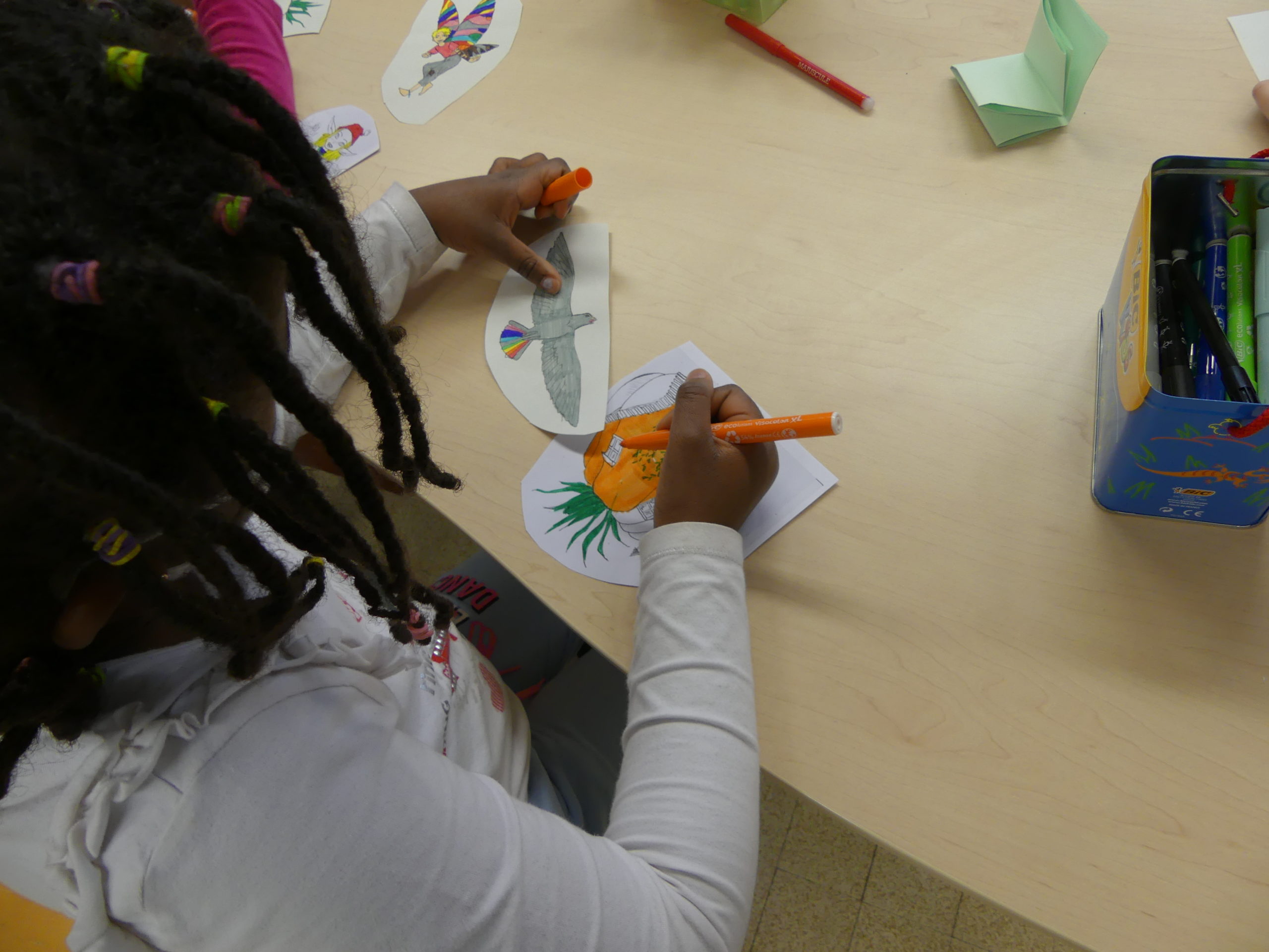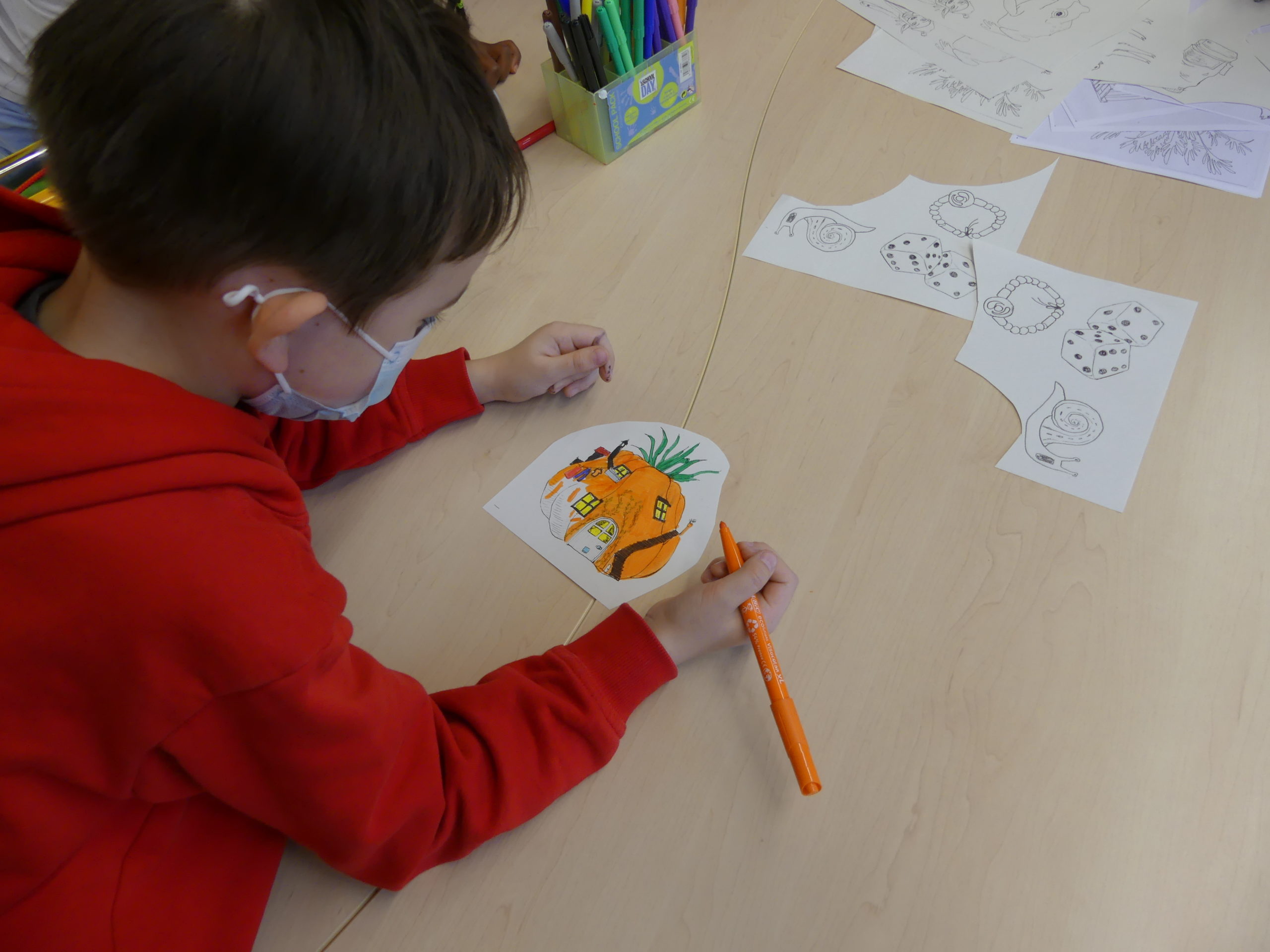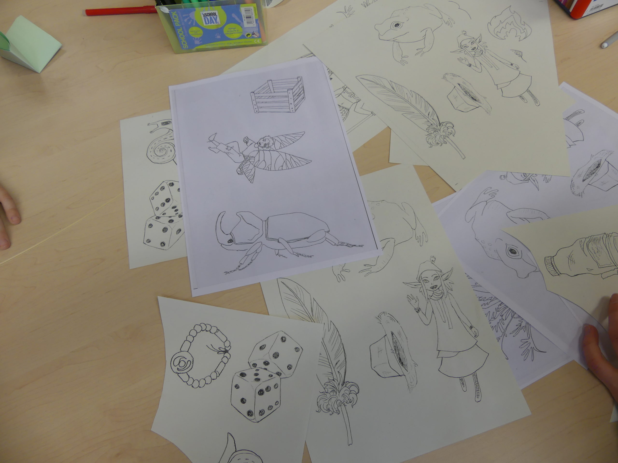 First step: cutting out and colouring the paper templates that will bring to life all the stories that the children made up. Fairies, boares, feathers, pumpkin houses, she-warriors… that is a lot of material for creativity ! Once the templates were finished, they were fixed on top of bamboo sticks which will be used to move them on the theatre scene.
