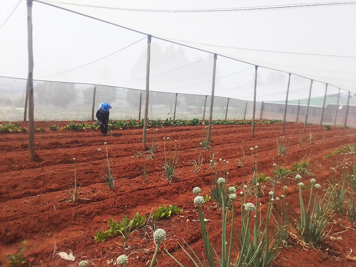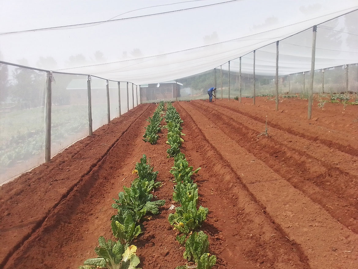 Some of the crops are grown under a greenhouse with a net to reduce evaporation and protect the crops.