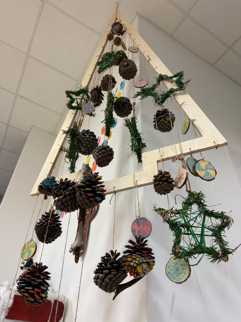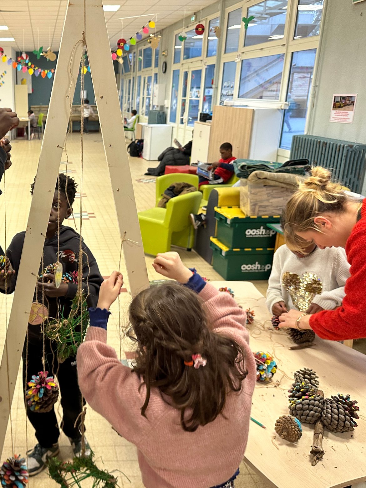 Les 24 enfants ont participé activement à l’activité et ont eu la joie d’admirer le résultat de leur travail, le sapin ayant été accroché sous le préau, à côté de la cheminée en carton déjà installée…