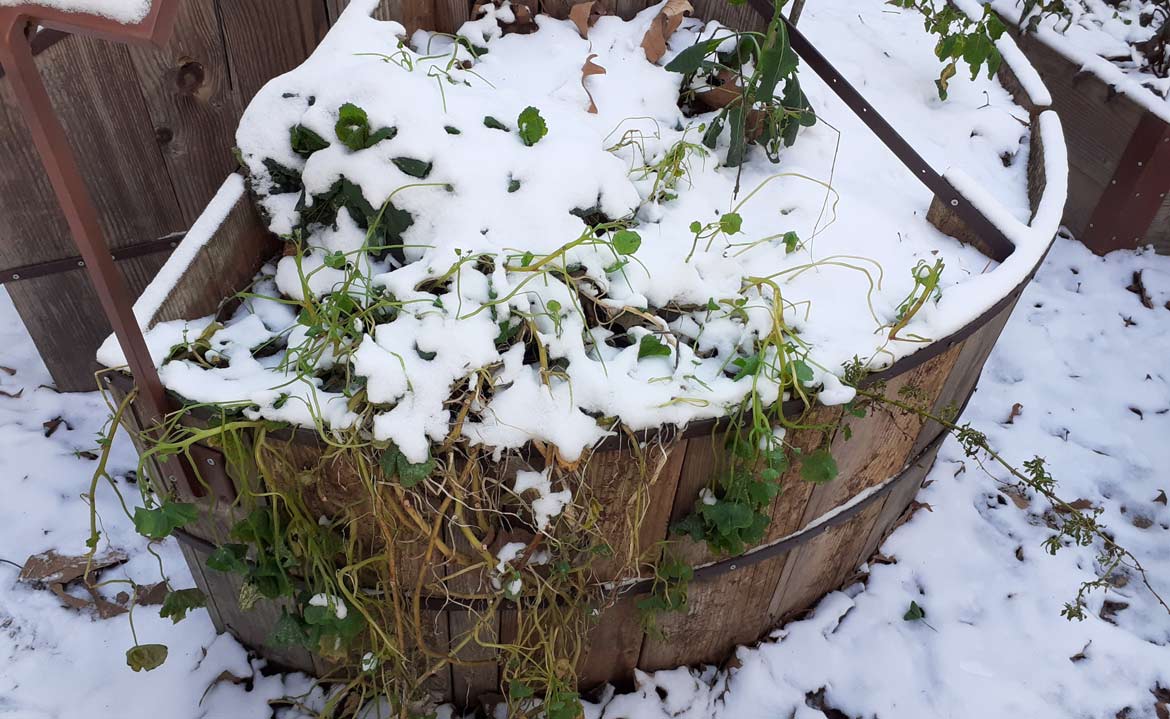 Rappelons que certaines plantes ont besoin du froid afin de se développer et même de fructifier. C’est le cas de la vigne notamment, dont une variété grimpe sur la pergola des aromates.