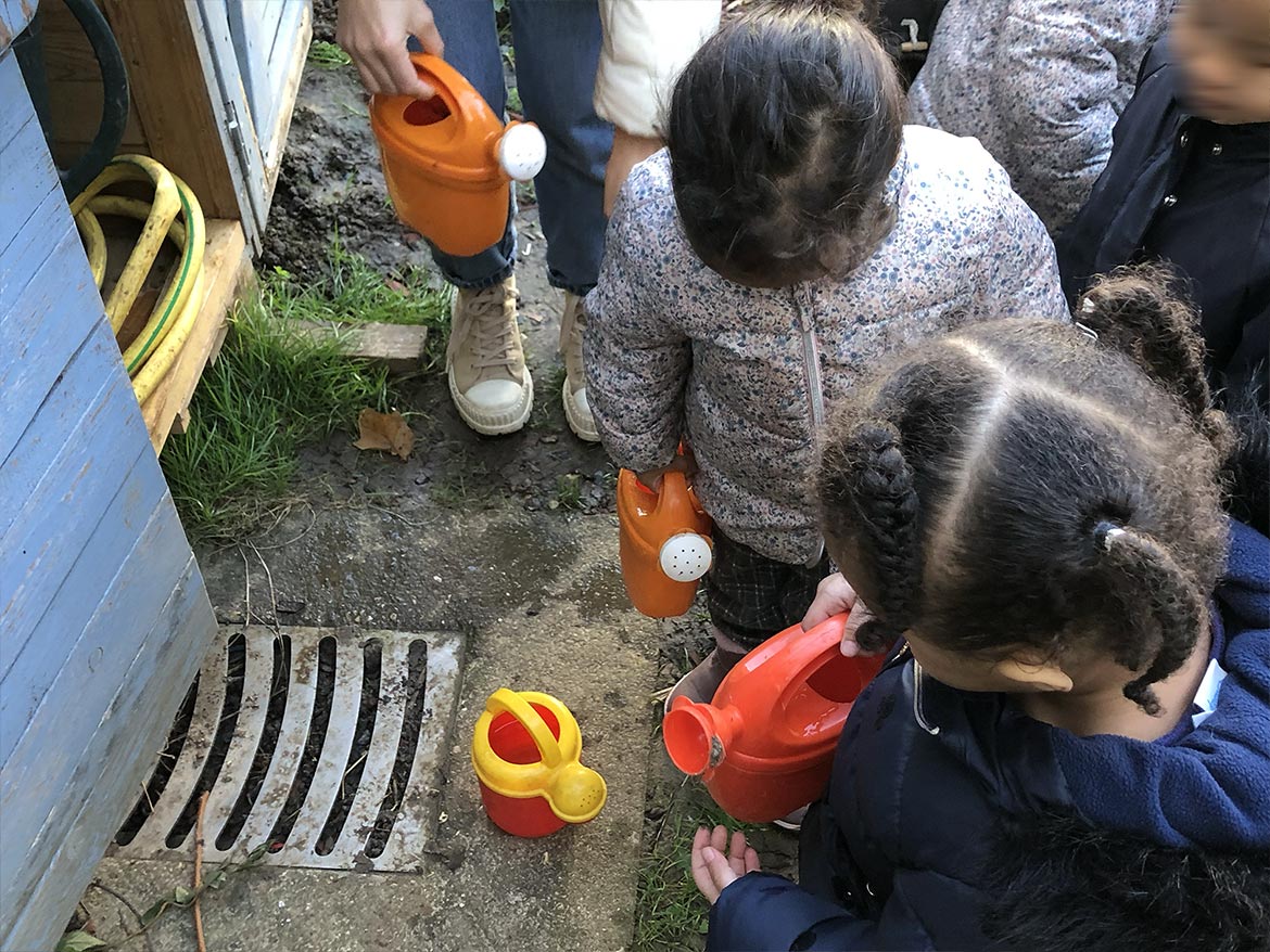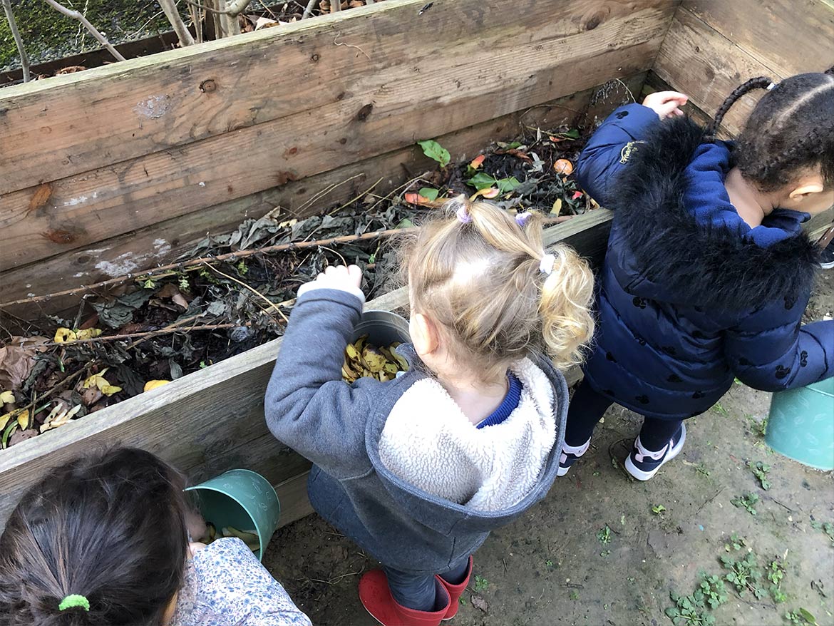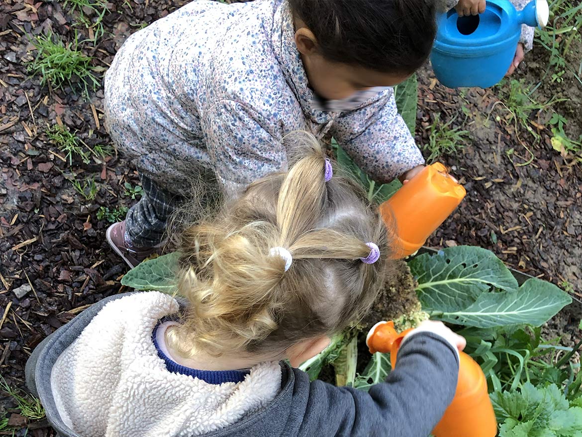 Les enfants viennent avec quelques déchets végétaux de la cuisine de la crèche et les mettent dans notre compost. Même si les plantes et légumes n’en ont pas forcément besoin en cette saison, les enfants les arrosent, ce qui leur permet d’améliorer leur motricité et leurs connaissances du jardinage. Ils adorent passer du temps dans la verdure et apprennent très vite.