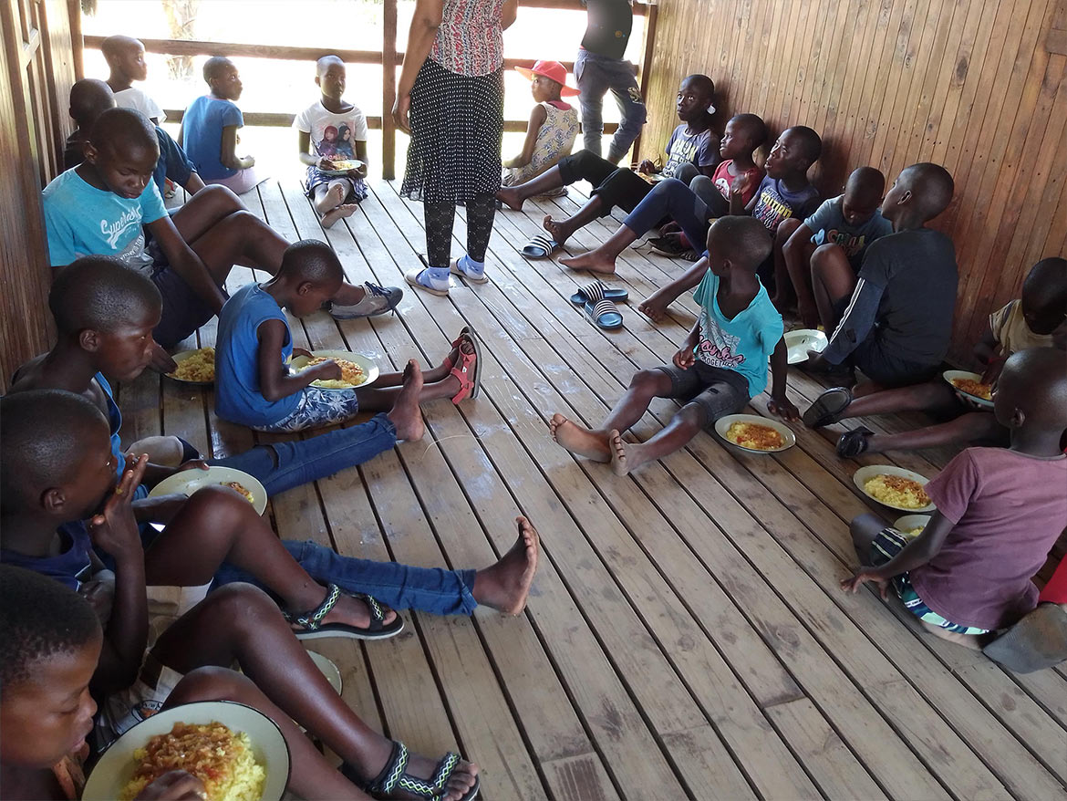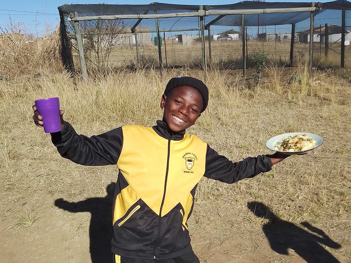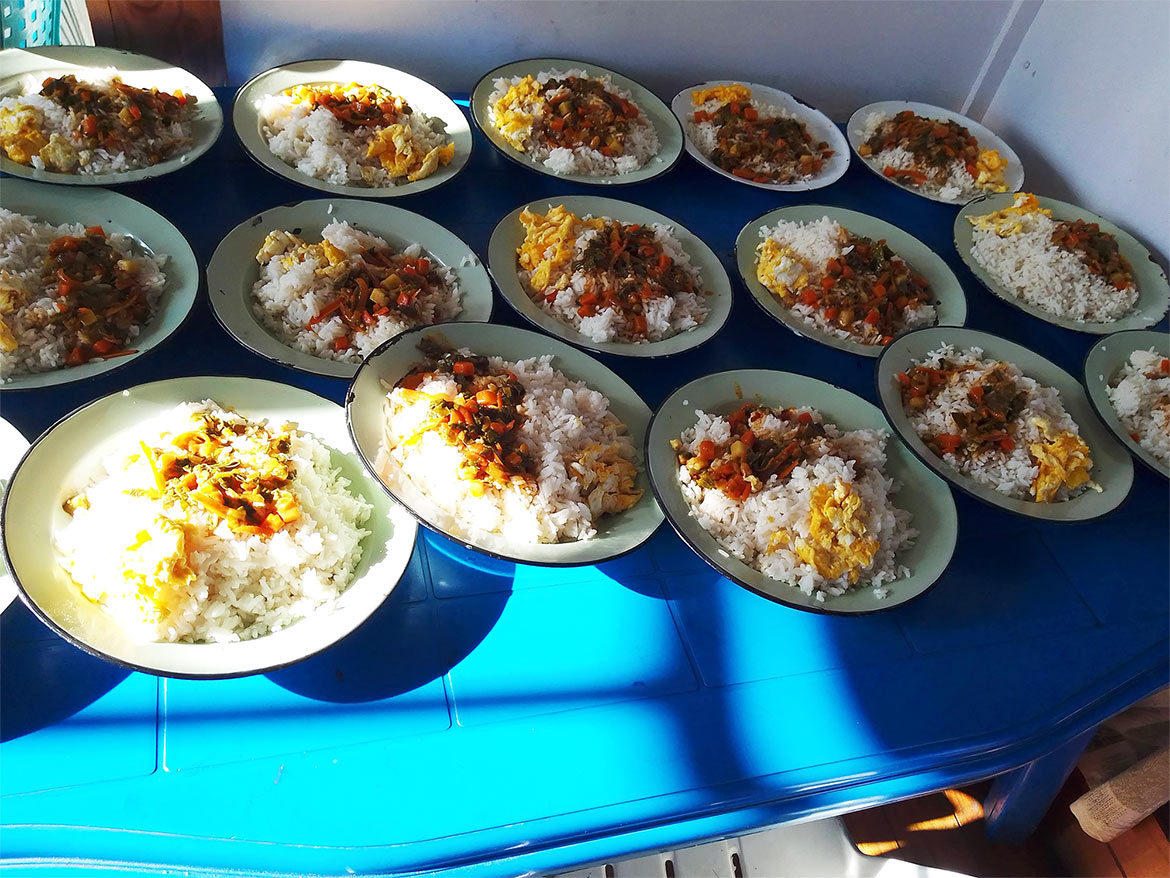 The meal consists of rice and a sauce prepared with vegetables from the garden. This nutritional support benefits about 50 underprivileged children in Roosboom township.