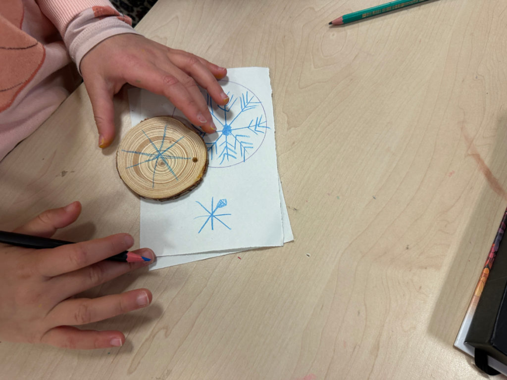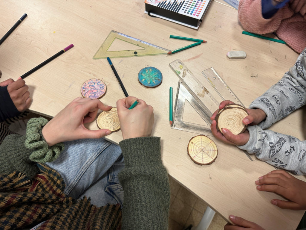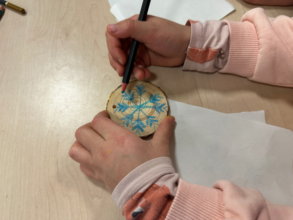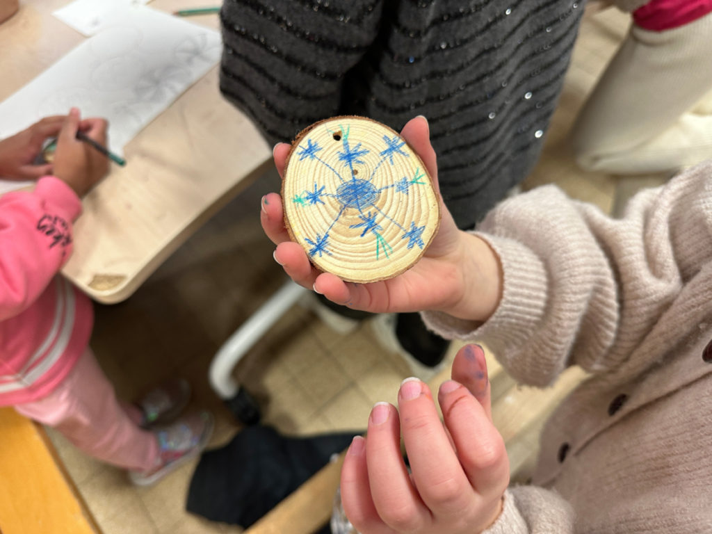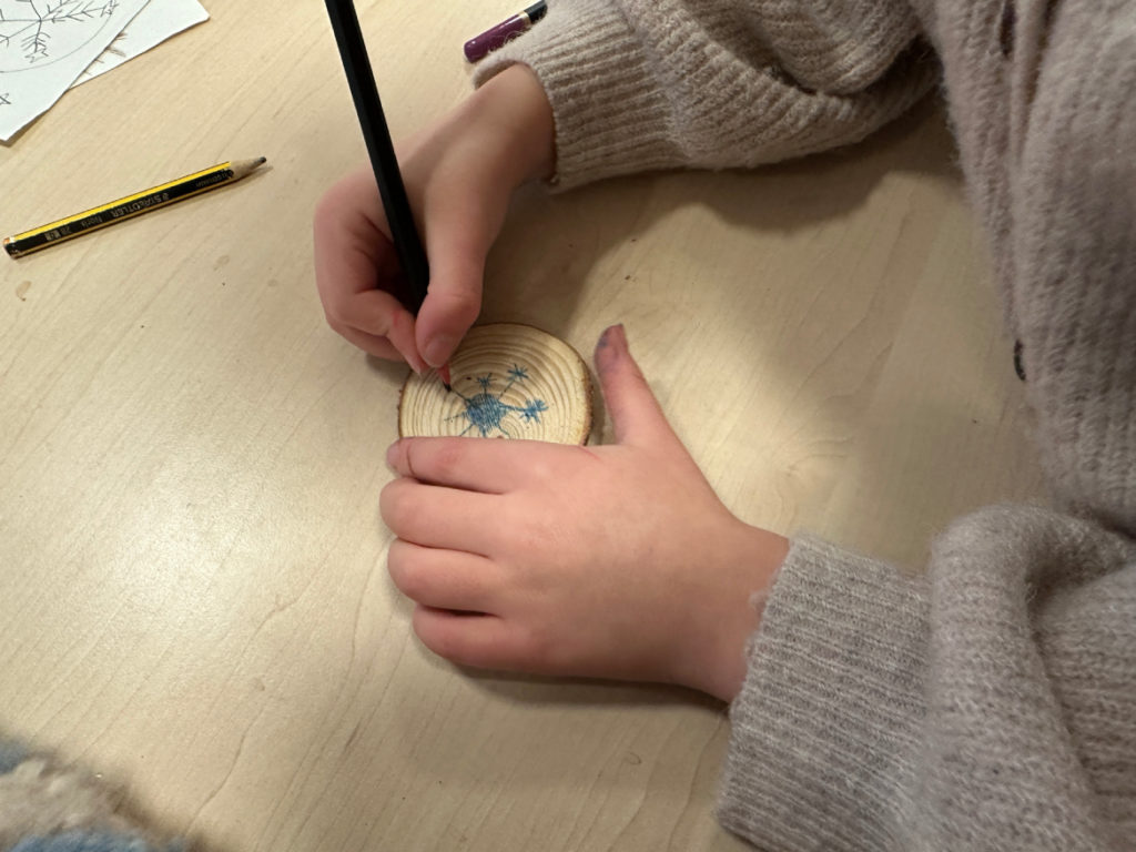As part of the Christmas workshops, the children worked on small wooden discs measuring 5 to 7 cm in diameter and approximately 5 mm thick.