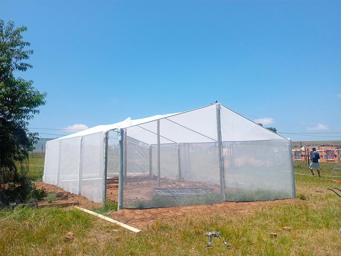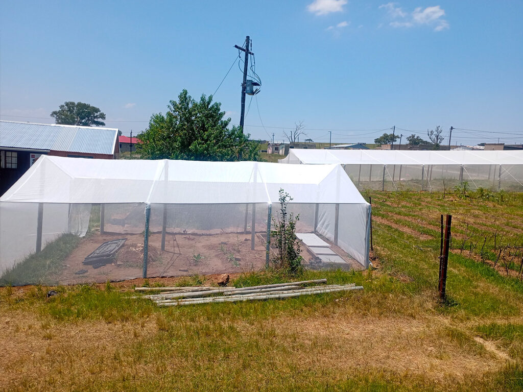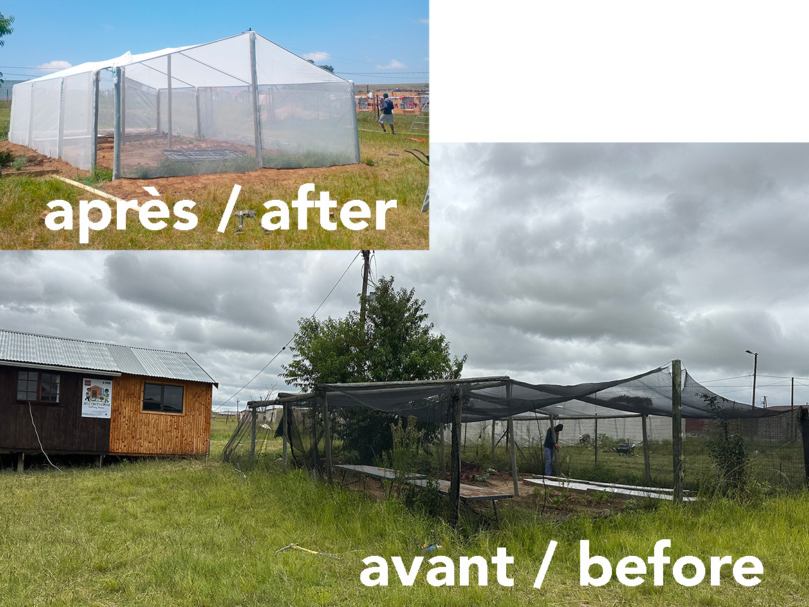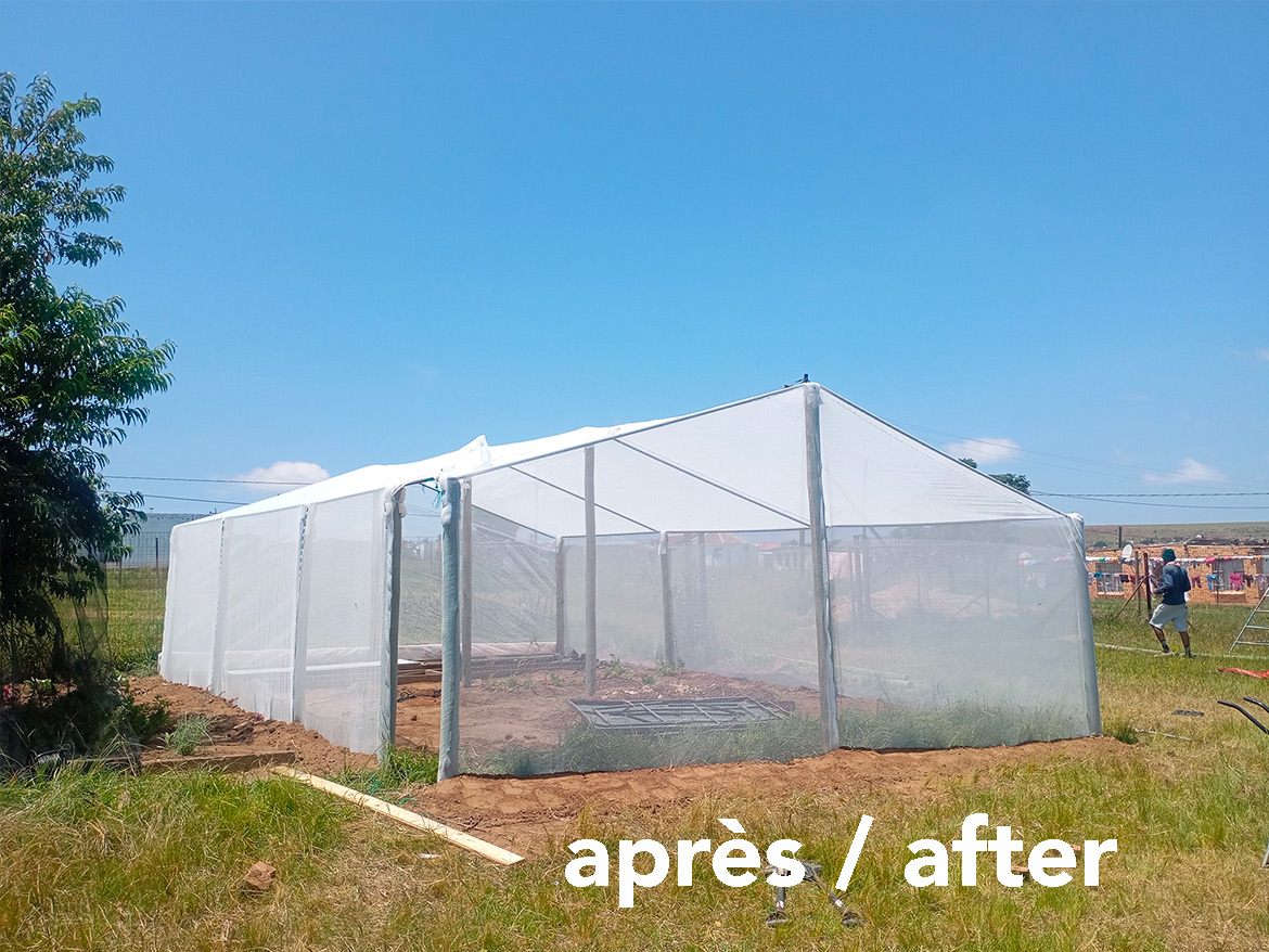 In Roosboom, there was an old greenhouse before the 200 m² greenhouse for market gardening was built. Although very dilapidated, it was still used as a nursery. Taking advantage of the arrival of gardeners from Levi’s Nek farm, the team undertook to rebuild a new one that was more functional and better suited to the climatic conditions.