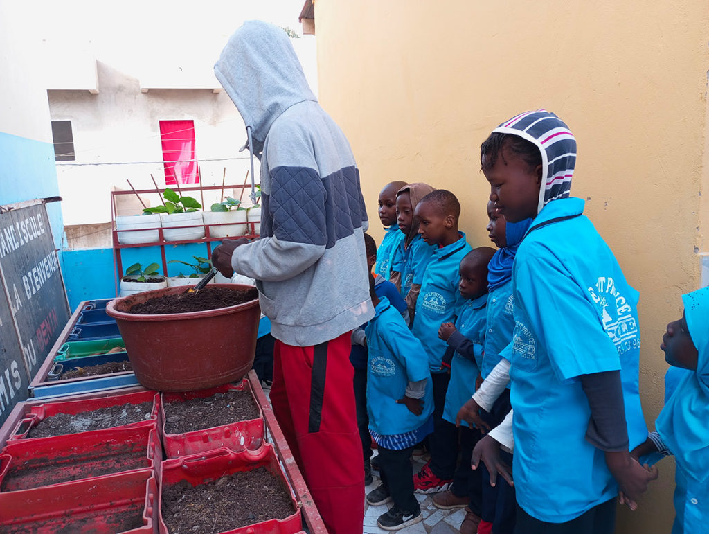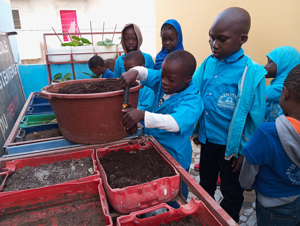 Les contenants en plastique recyclés, coupés en deux et disposés sur des structures métalliques conçues par l’association, sont garnis de terre végétale avec les enfants de l’école, sous l’encadrement de Joseph, responsable du potager depuis sa création en 2022 par Dessine l’Espoir, avec le soutien de Marie Munoz.
