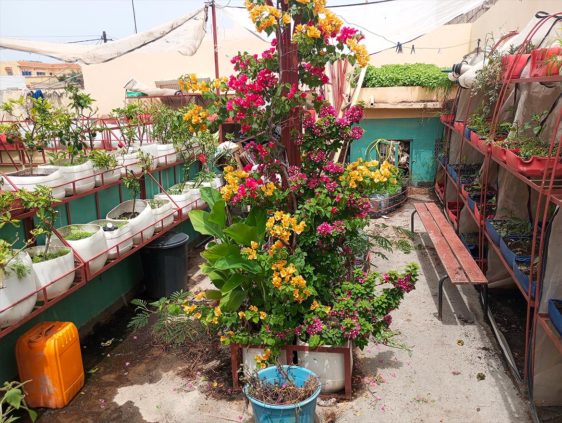 Le potager urbain conçu par l’association utilise des structures métalliques innovantes pour optimiser l’espace en permettant des cultures étagées. Les cultures sont réalisées dans des bacs et bidons en plastique recyclés. Les enfants participent quotidiennement à l’entretien du potager.