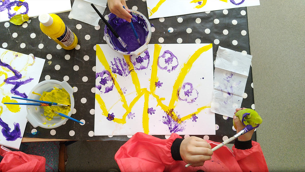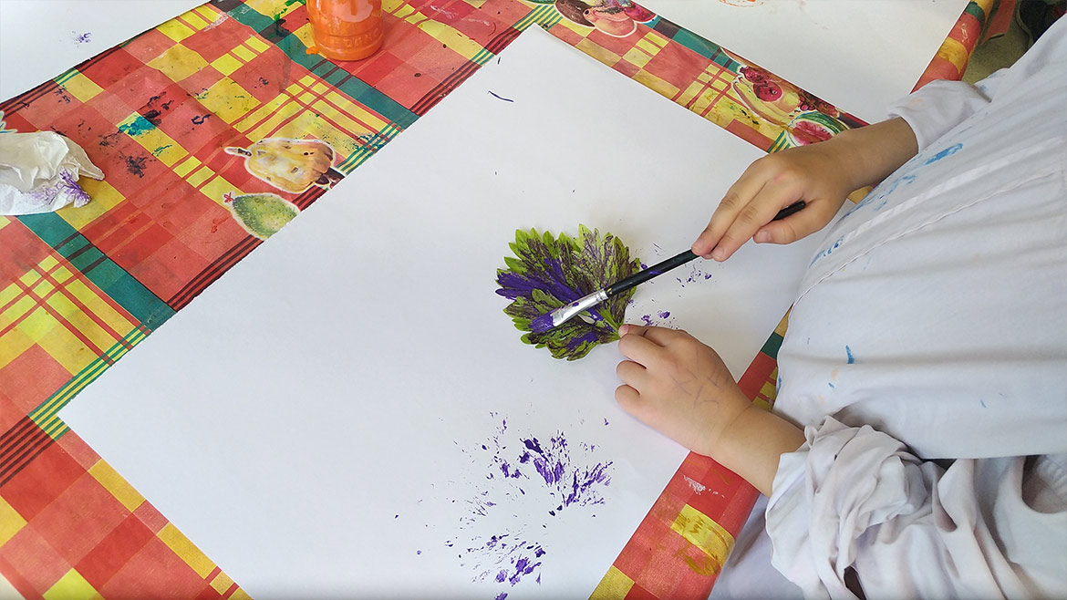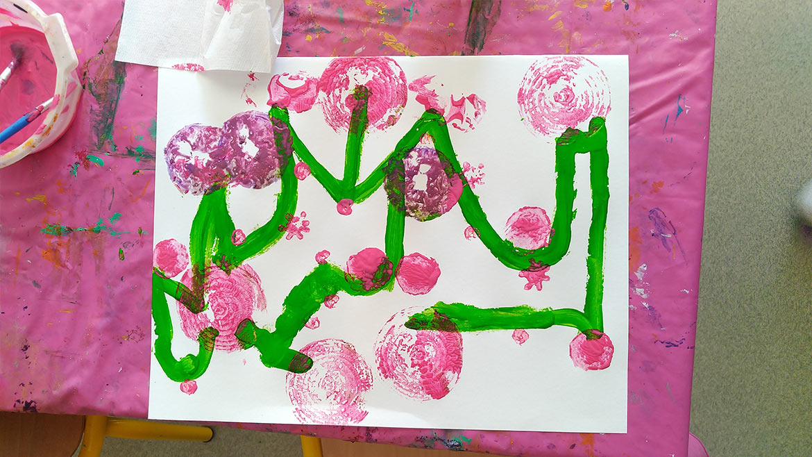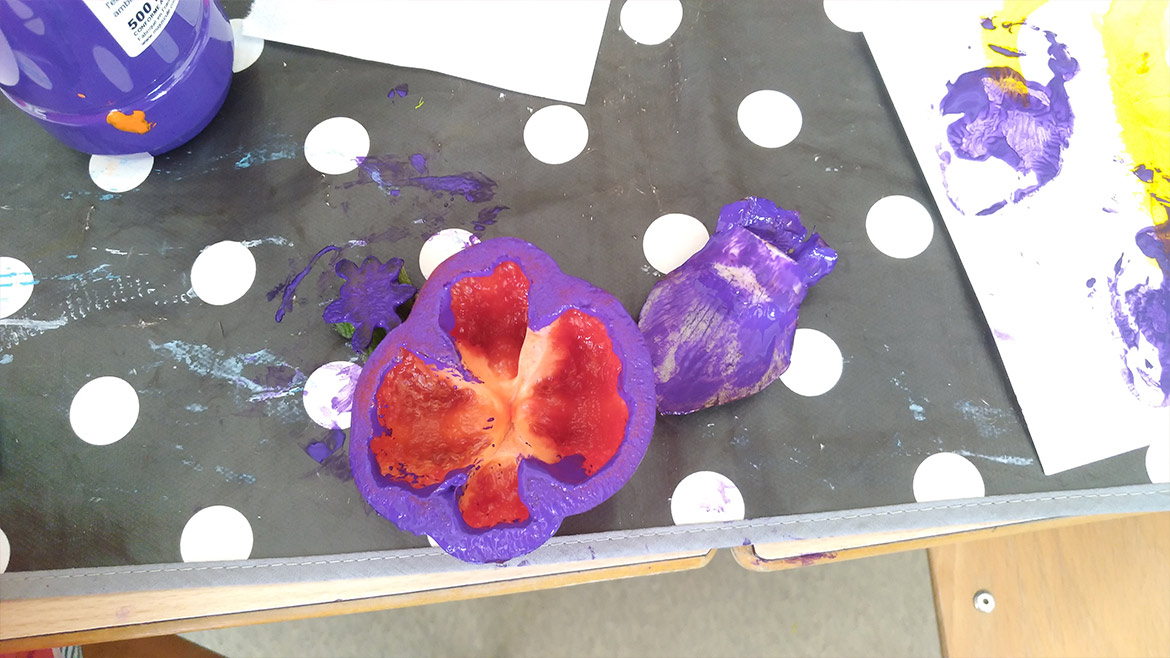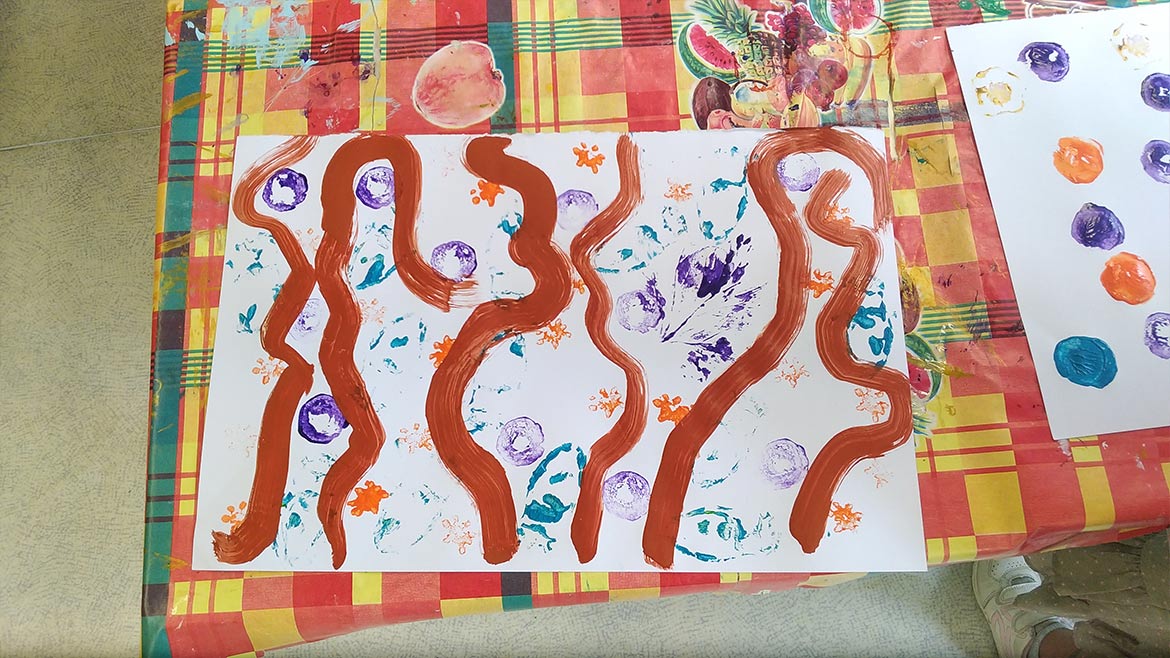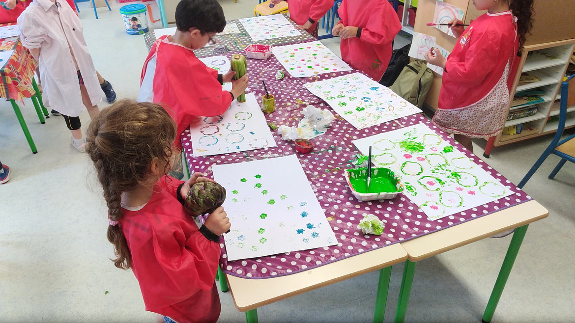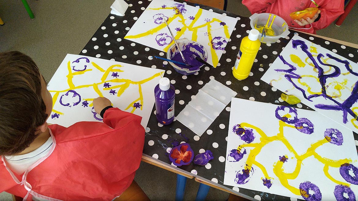 After drawing branches on paper sheets, they got to decorate them with multicolored fruits, by using lemons, bell peppers, zucchinis, onions, celery and artichoke leaves as stamps to apply paint on paper.