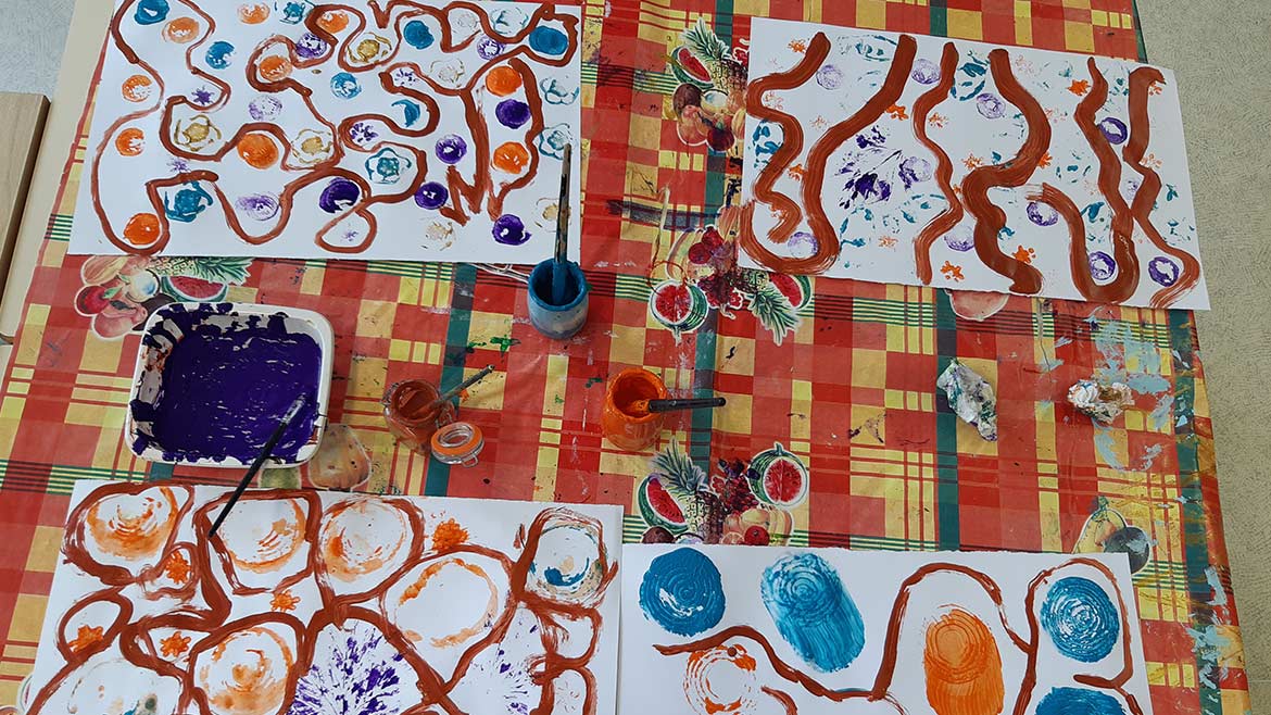 The head of the zucchini imitates the shape of a small star ; as for the onion, it reproduces concentric circles that create the most pleasant effect on paper… Thanks to this activity, the children learned how to recognize the different fruits and vegetables that they used, and they understood that the products that nature gives us can look as beautiful as they taste good !