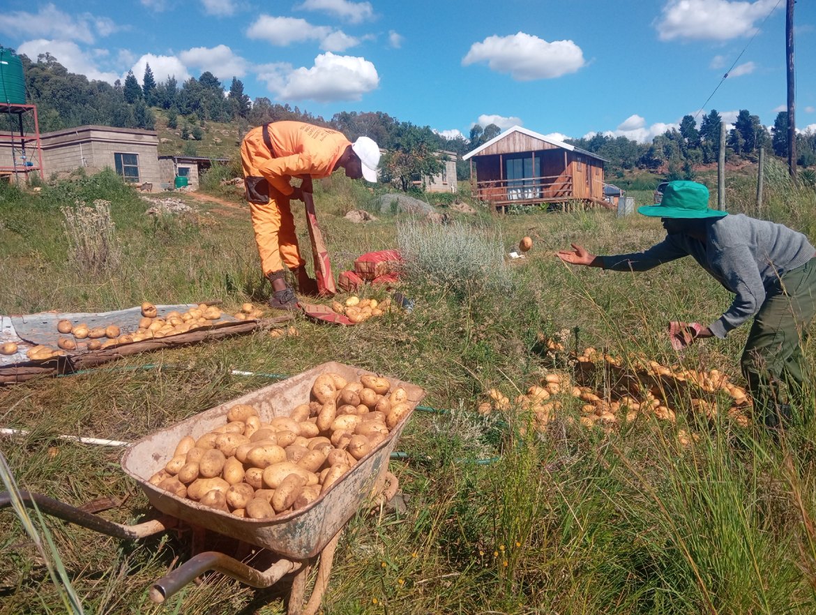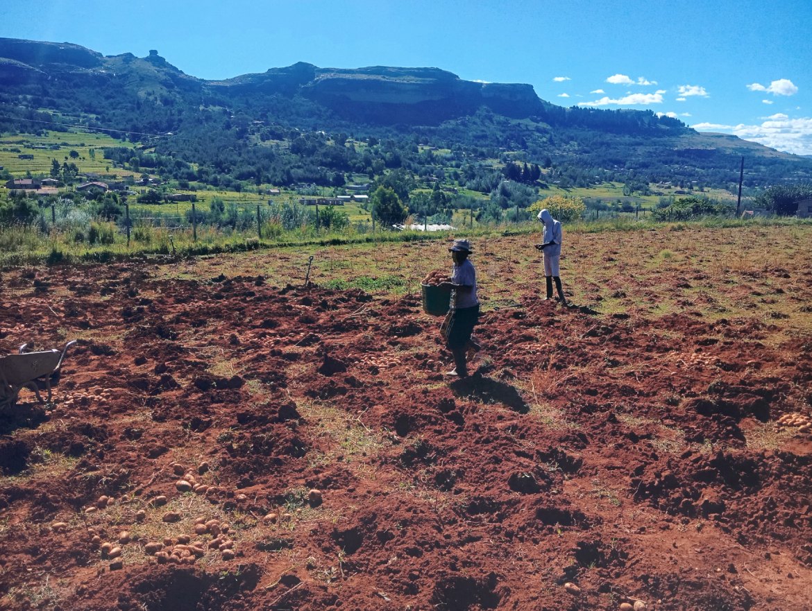 Young deaf and hard-of-hearing farmers from Levi’s Nek have harvested part of their potato field. These vegetables will be added to the tomatoes, peppers and spinach harvested to fill the parcels of fresh vegetables distributed to the most vulnerable HIV-positive patients at the medical centre near the farm.