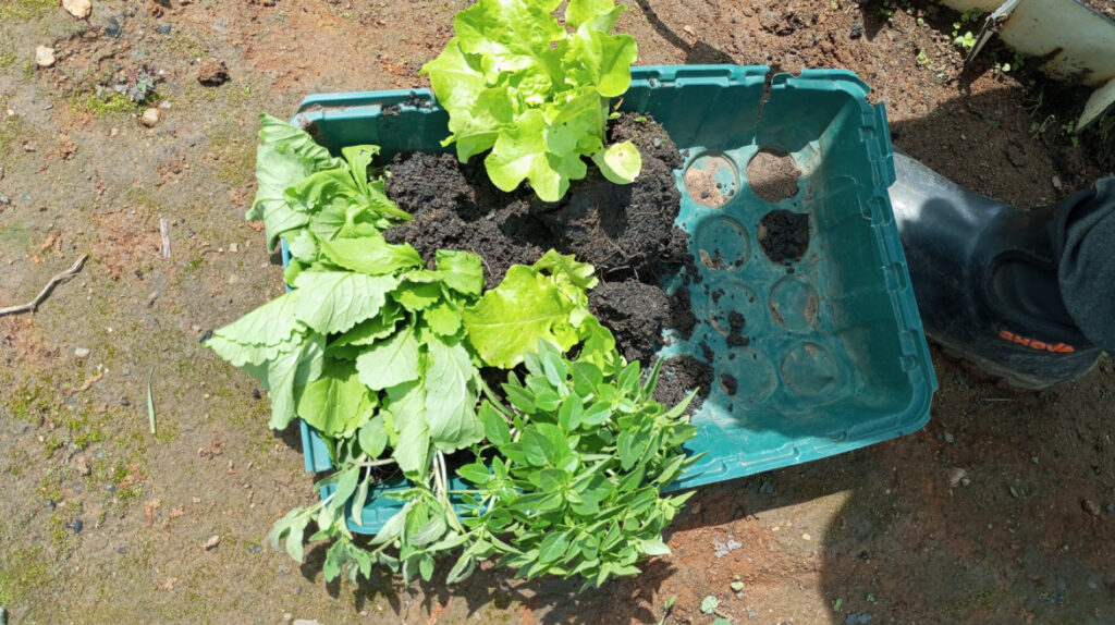 Sous la serre du Jardin des Savoir-Faire, les jeunes plants ont bien grandi et  les plants de cucurbitacées et les salades sont désormais prêts à être repiqués. Les femmes du Jardin ont procédé à leur mise en pleine terre, sur les planches de culture soigneusement préparées. Courges, concombres et salades vont maintenant profiter du soleil et des soins attentifs de l’équipe.