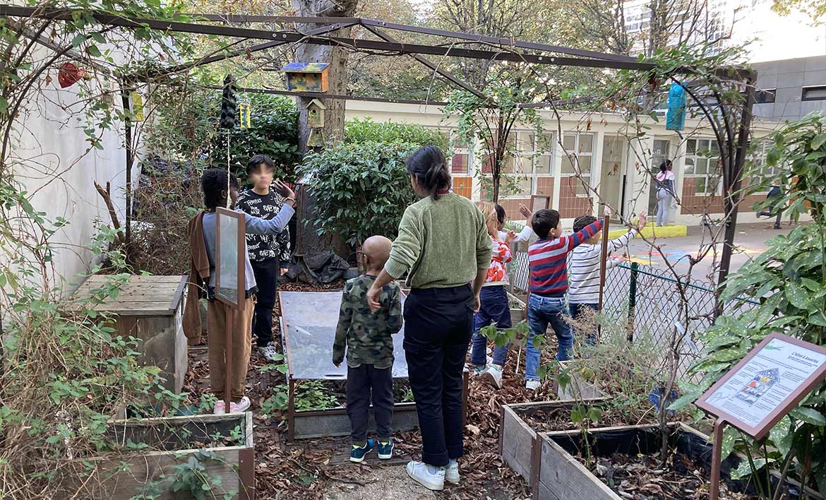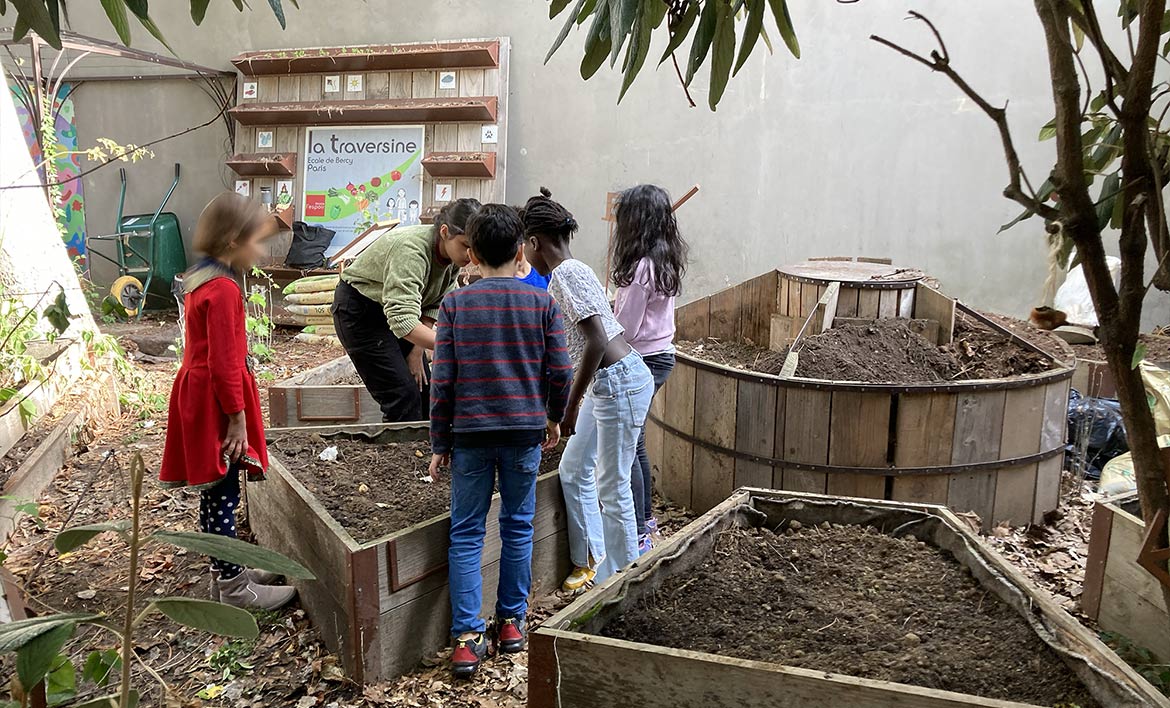 Les bacs ont été garnis par strates, en utilisant des feuilles mortes en partie inférieure mélangées à de la terre végétale. Les feuilles de platane, collectées dans la cour de l’école à l’automne 2021, ont bien amorcé leur décomposition et constituent un engrais naturel qui va nous aider à maintenir un substrat léger et aéré dans les bacs. Ce travail a été réalisé avec l’aide des enfants de l’élémentaire de Bercy.