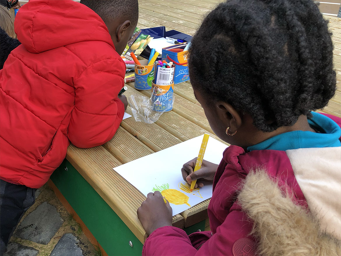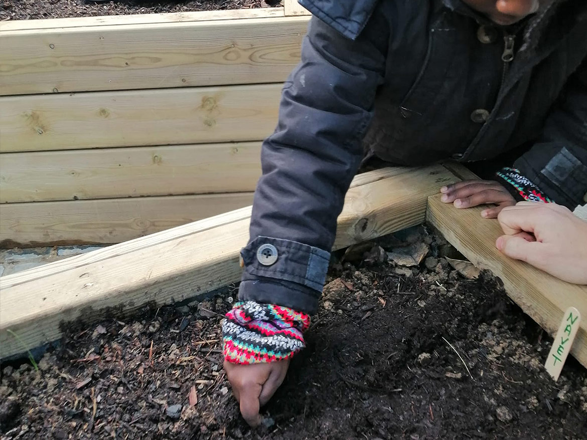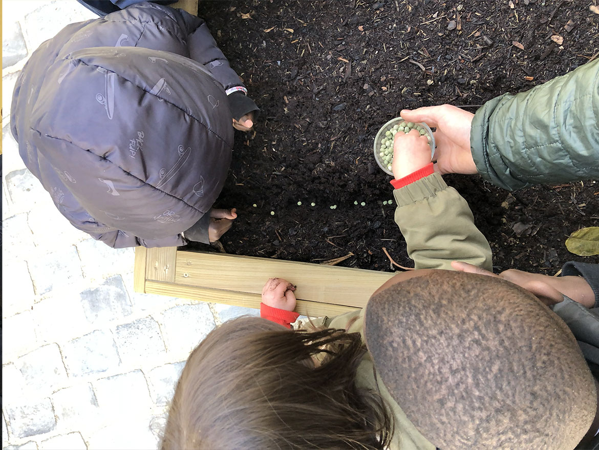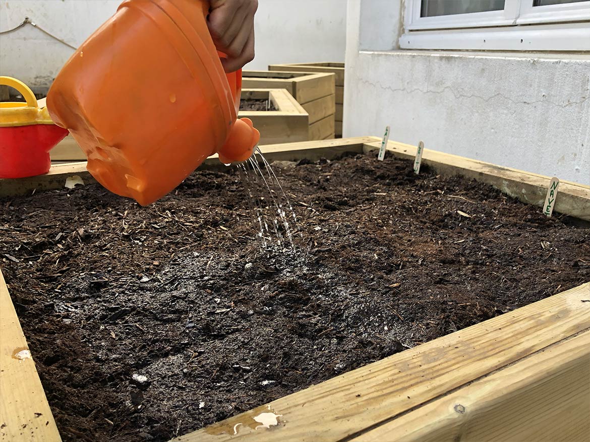 Hoping that the first sprouts will survive the cold winter, the children sowed yellow turnips, lettuce, round peas and red carrots. These are all vegetables that the children will be able to see growing in their playground, but they will have to wait until spring to taste them.