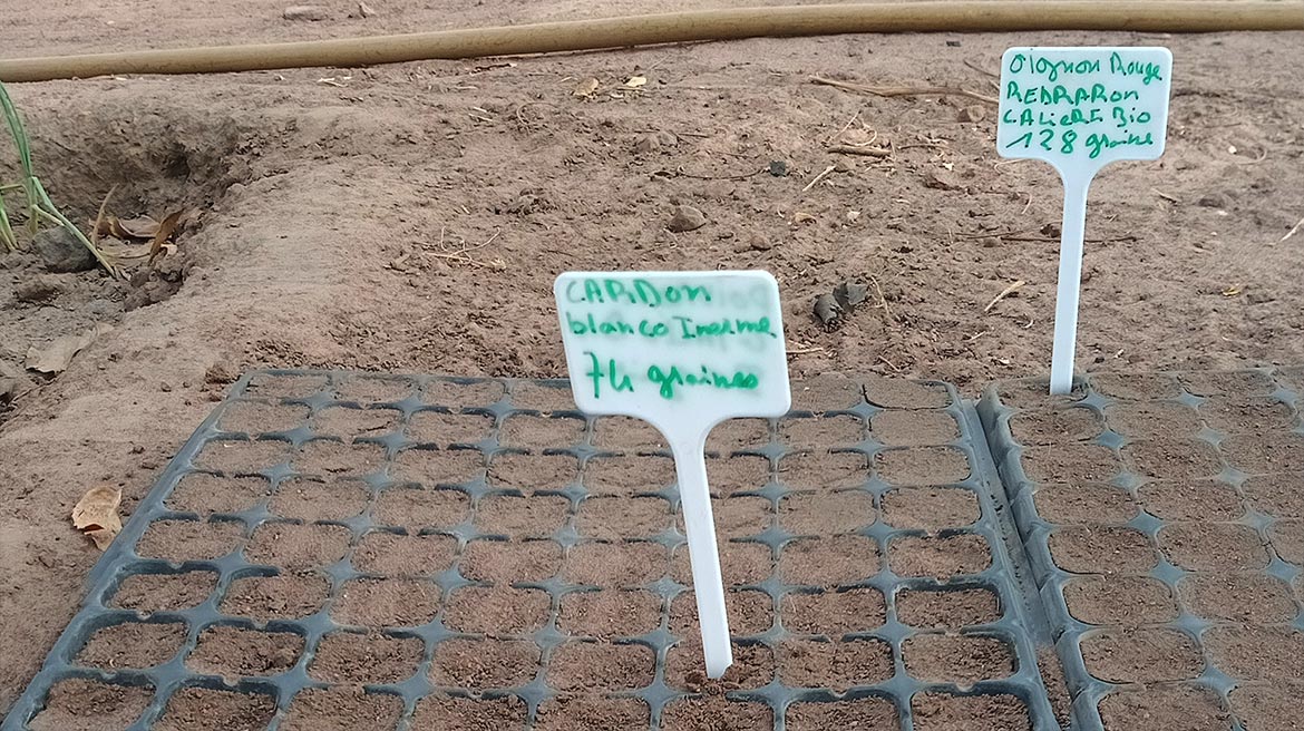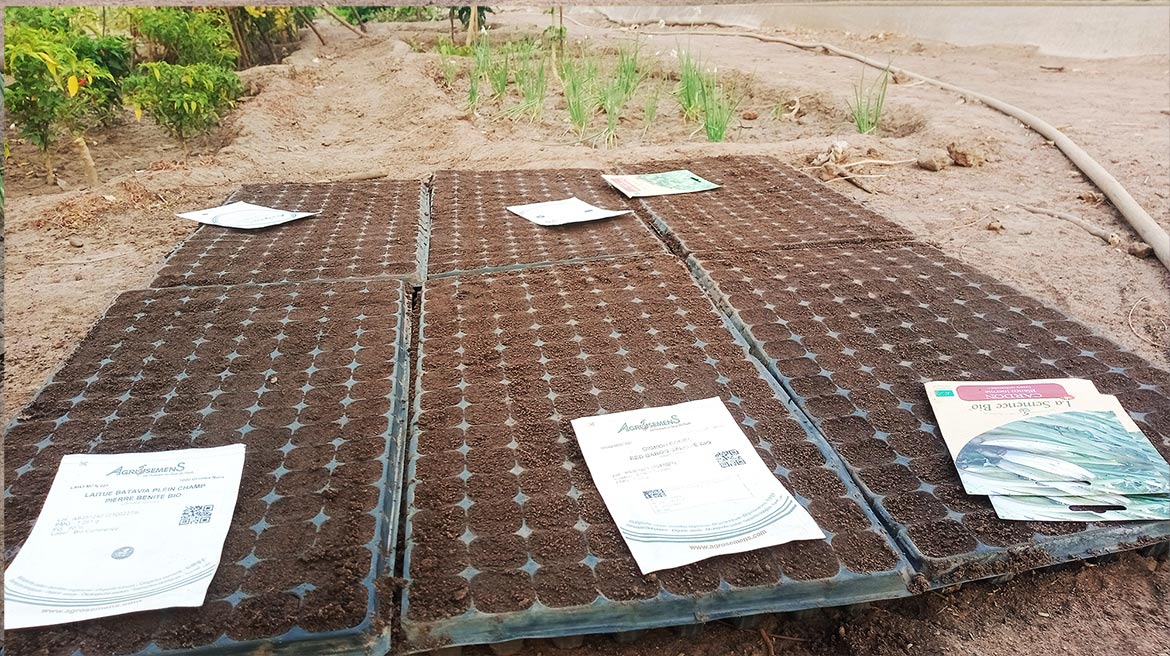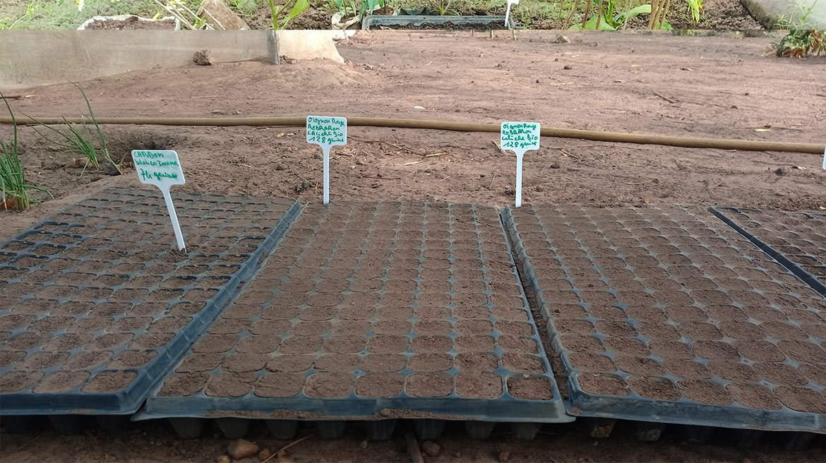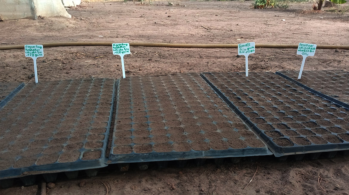 The Bala medical centre in eastern Senegal, near Tambacounda, is one of the pilot sites associated with this initiative. Abdourhamane, head of the Bala garden, has prepared new trays with seeds from the project partner: tomatoes, aubergines, peppers, lettuce and red onion. For tomatoes, aubergines, peppers and lettuce, the seeds are second generation seeds from local crops grown in the greenhouse during the previous season.