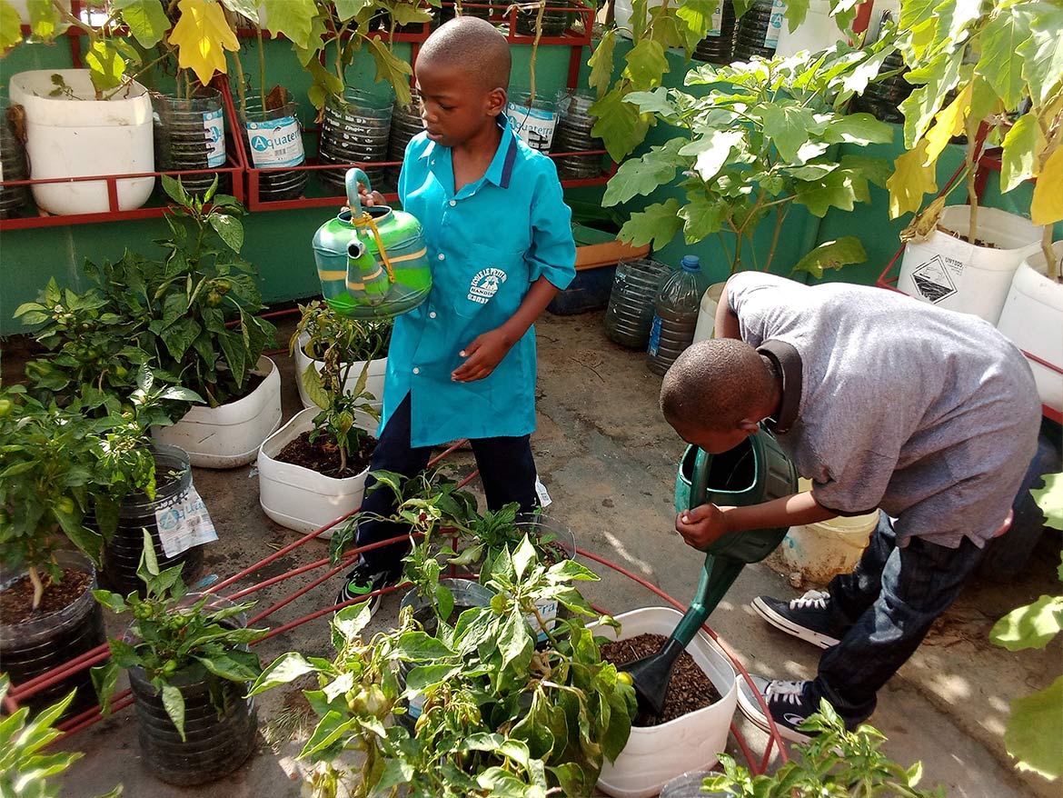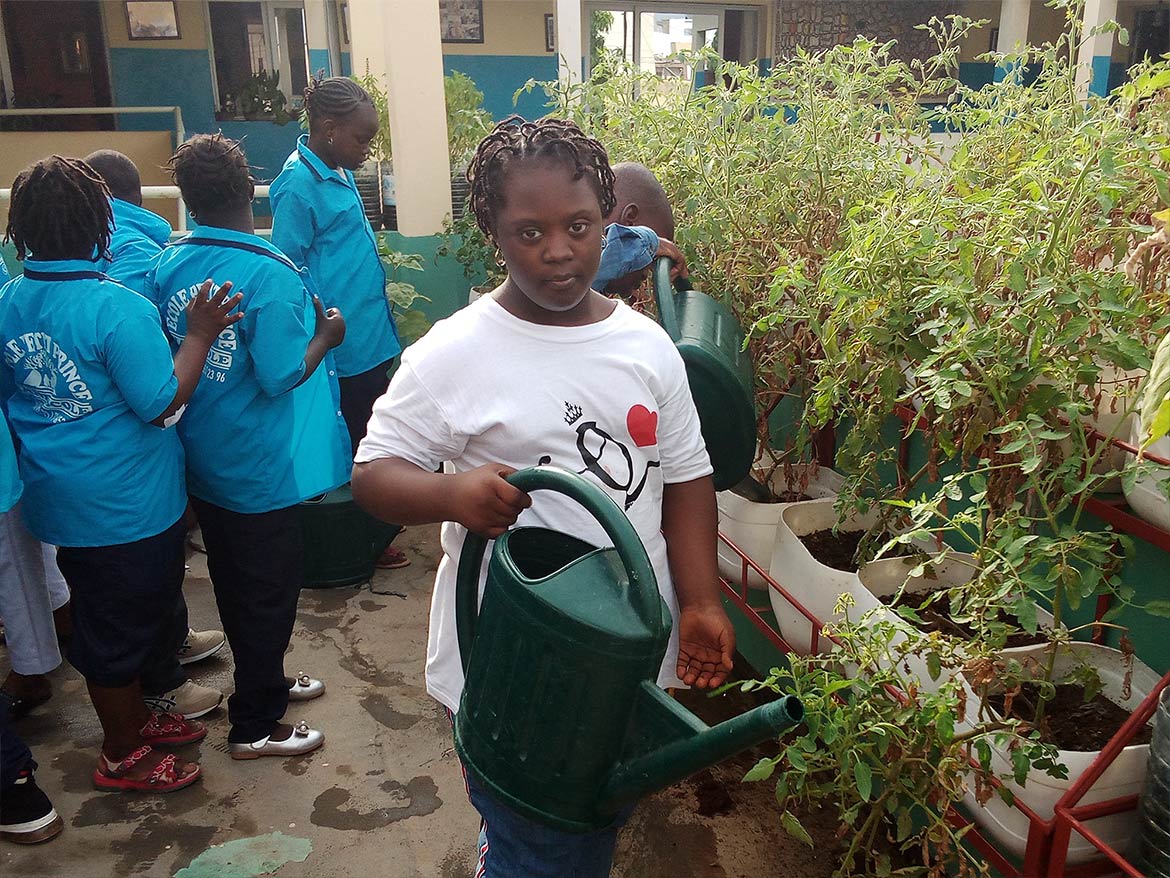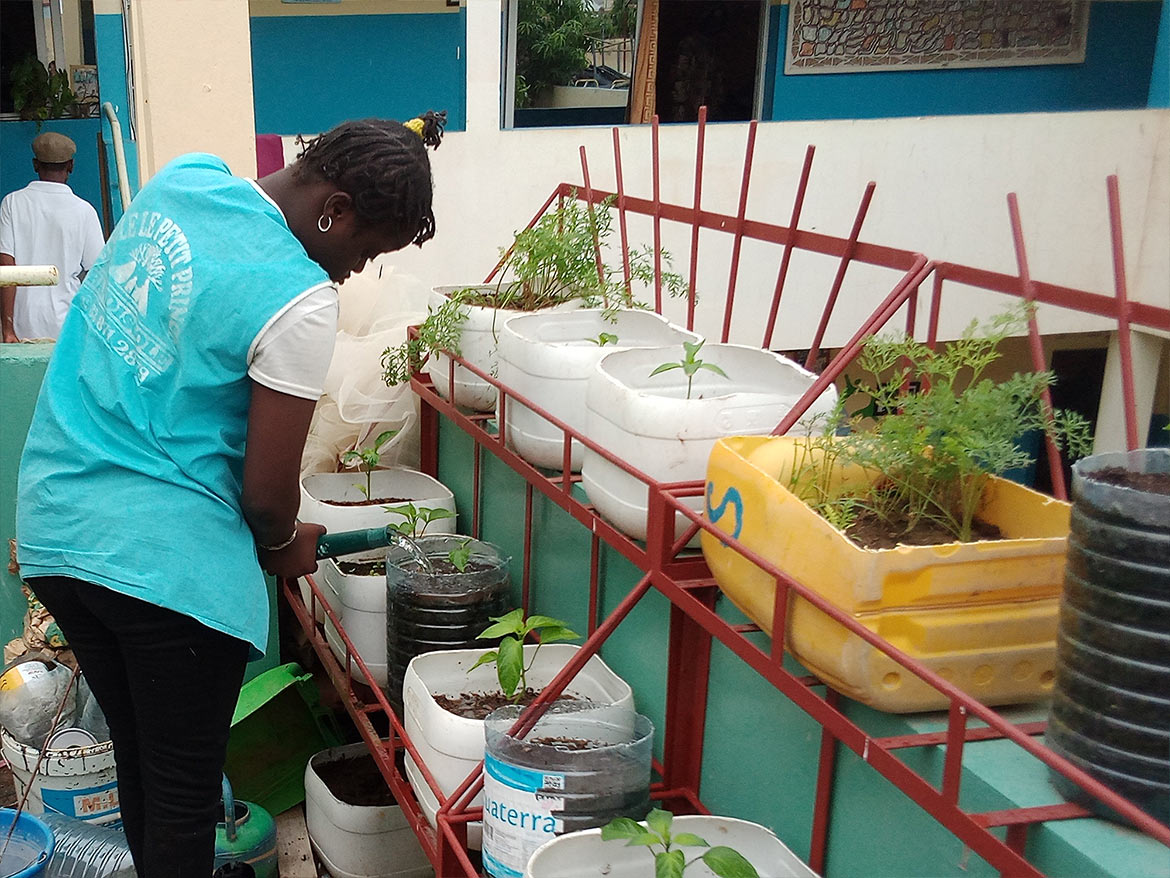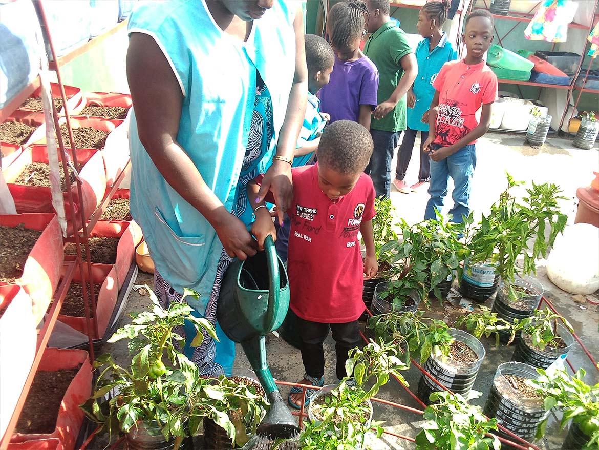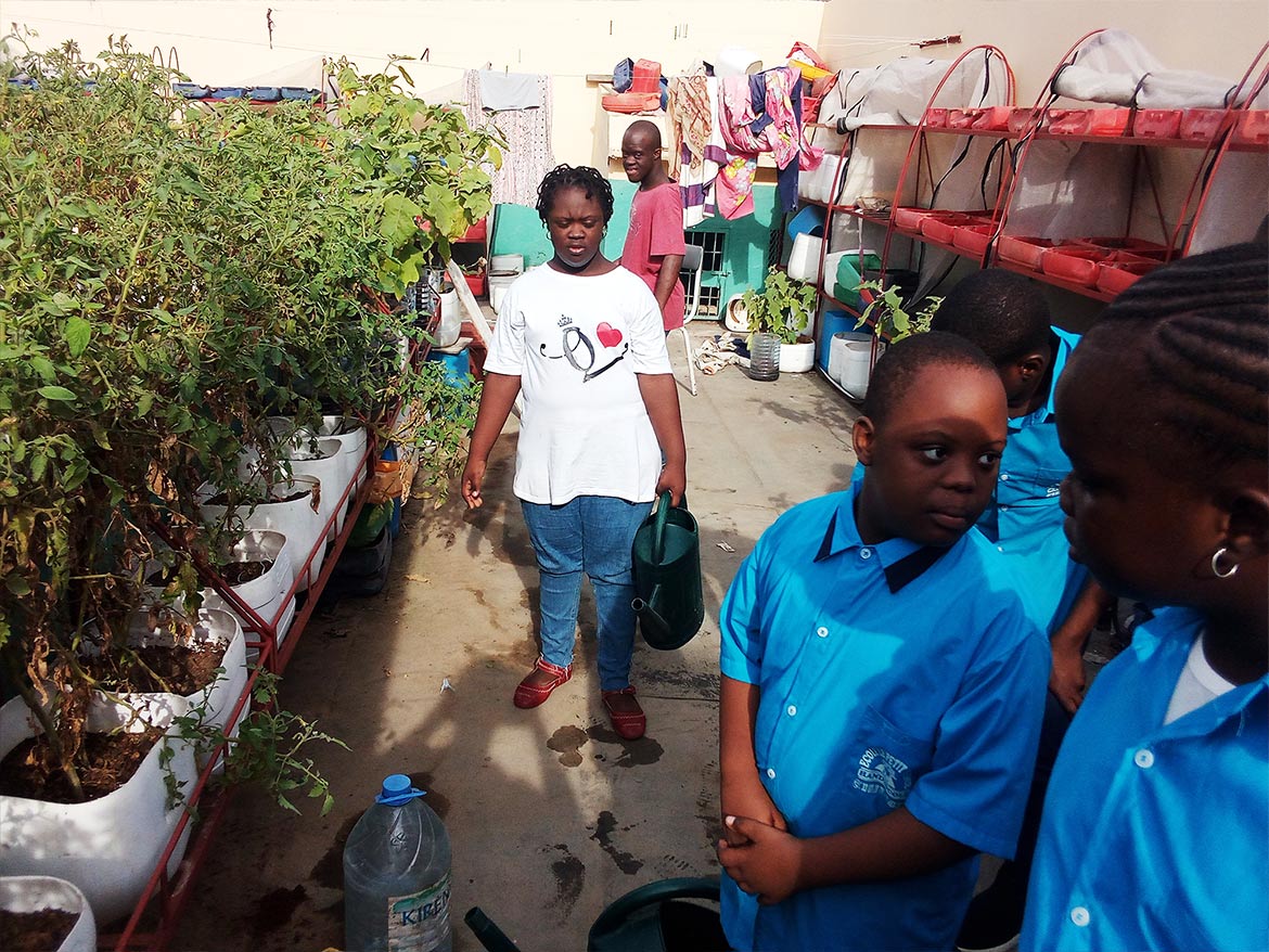 On the roof terrace of the inclusive school of the Petits Princes in Rufisque, the garden developed by Designing Hope welcomes the children every week for a moment of active recreation, dedicated to the maintenance of the garden.
