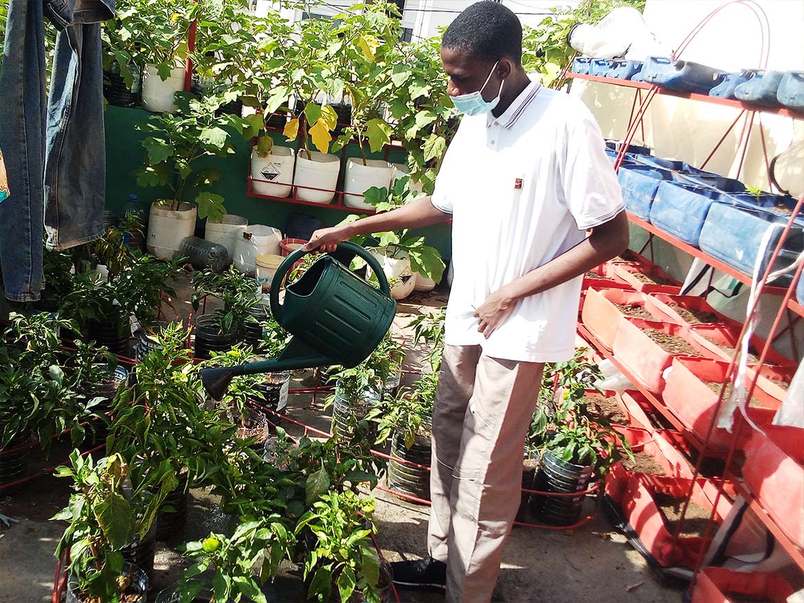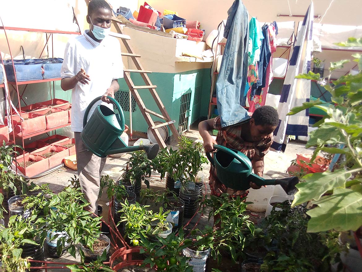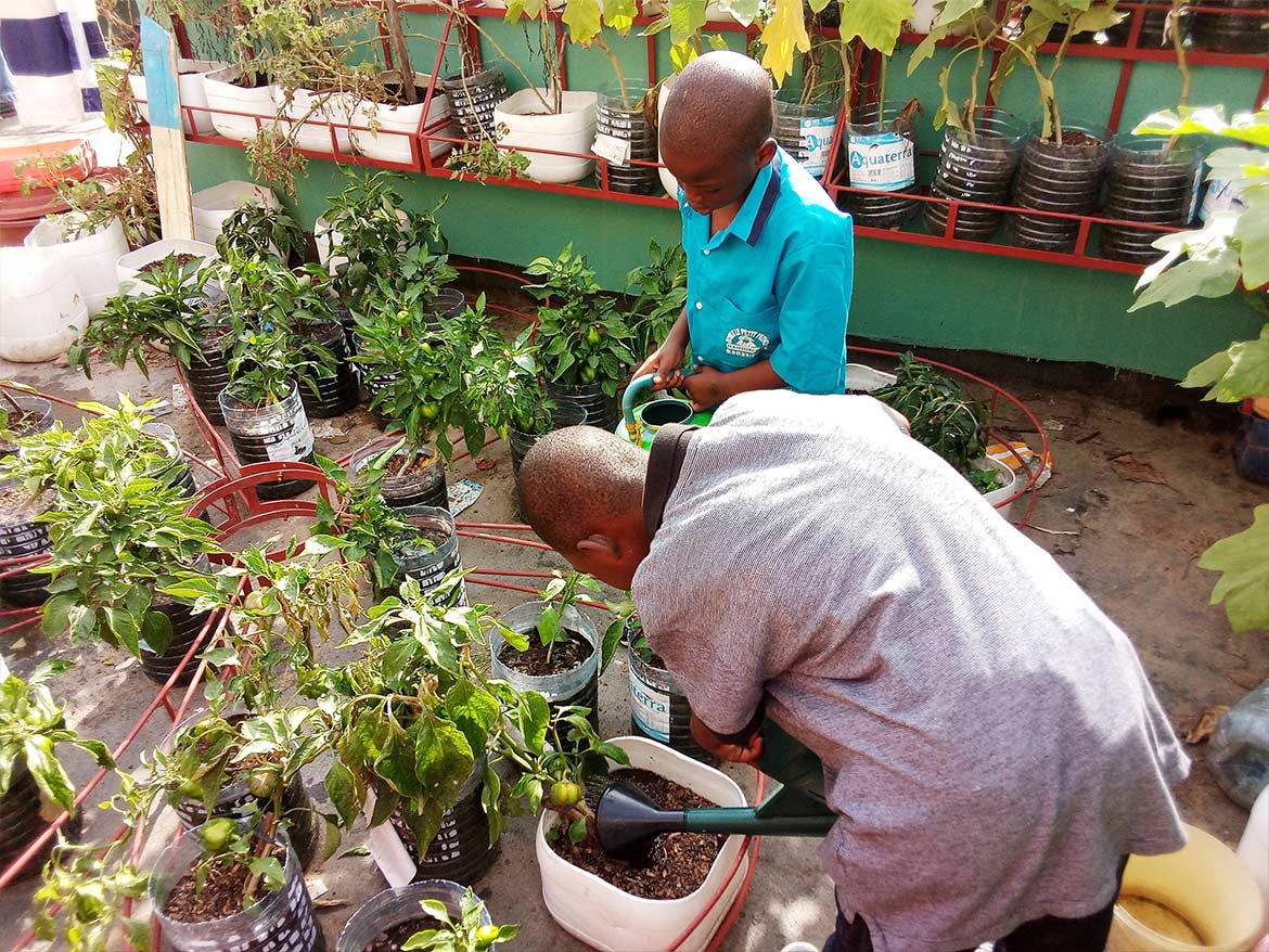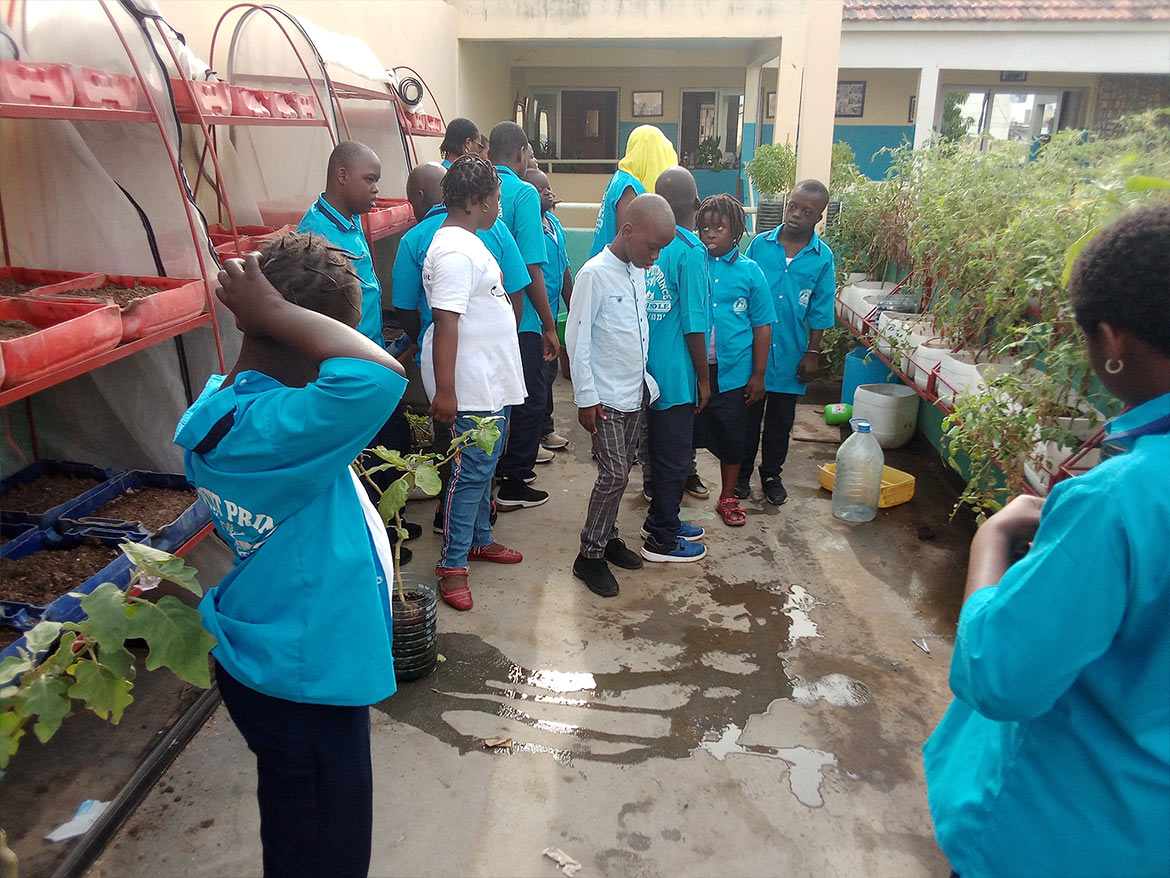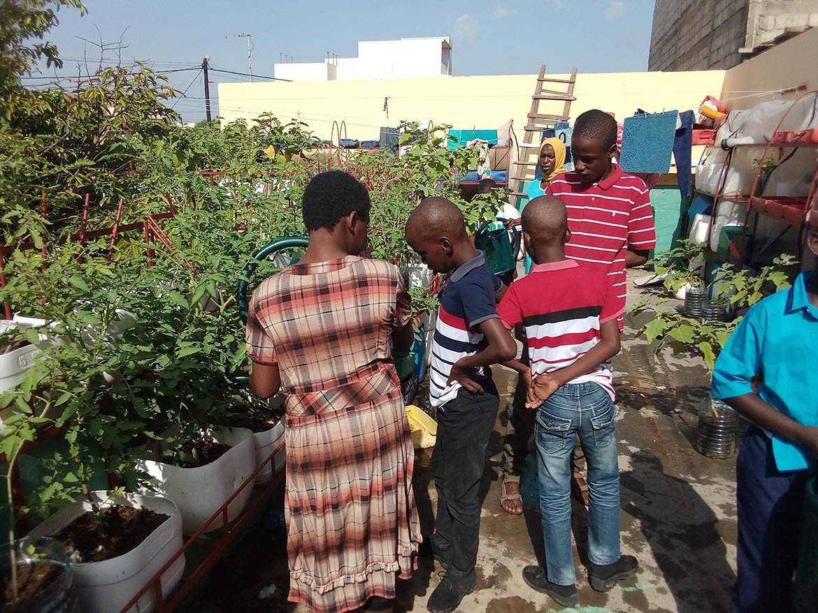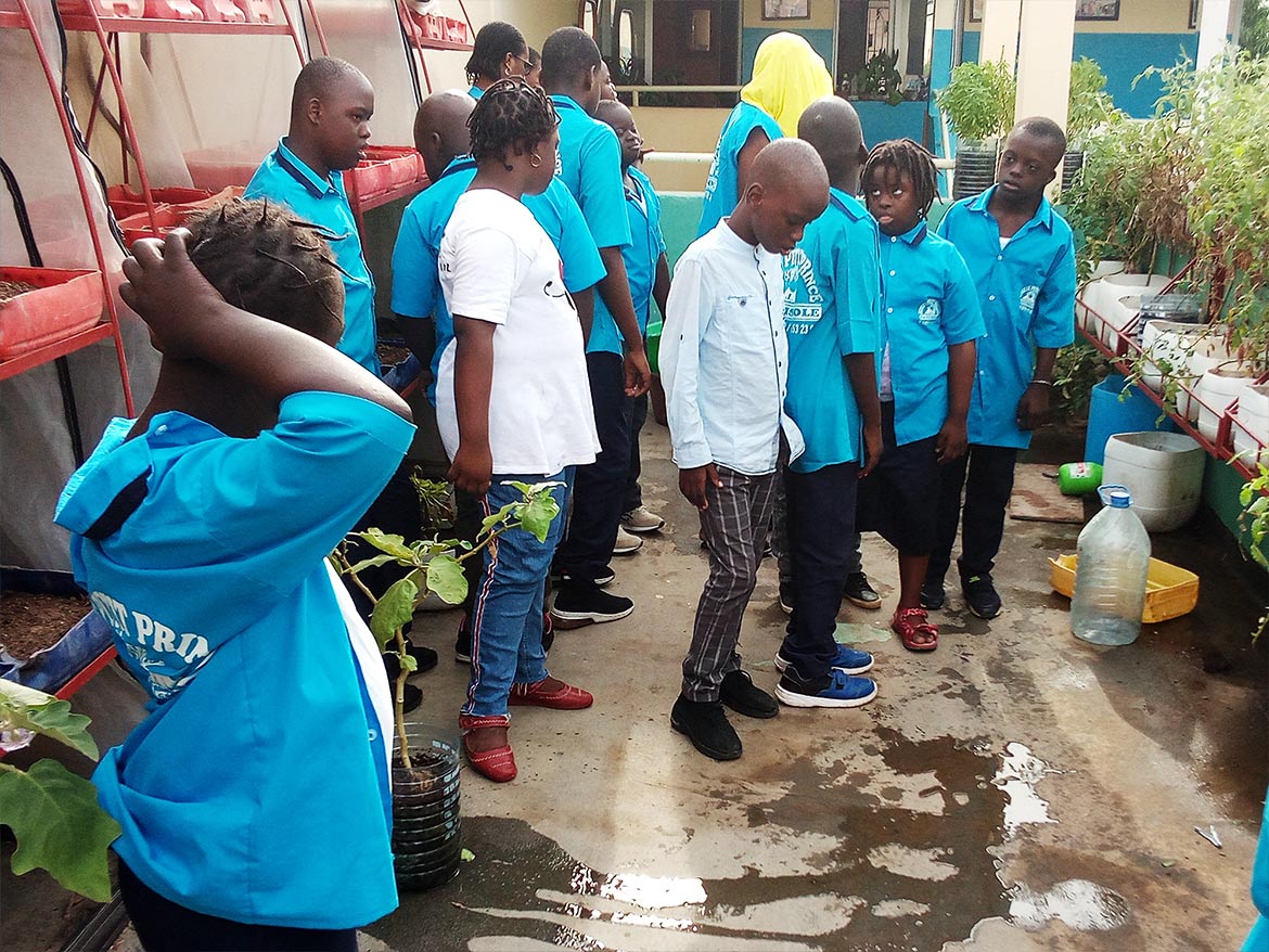 On the roof terrace of the inclusive school of the Petits Princes in Rufisque, the garden developed by Designing Hope welcomes the children every week for a moment of active recreation, dedicated to the maintenance of the garden.